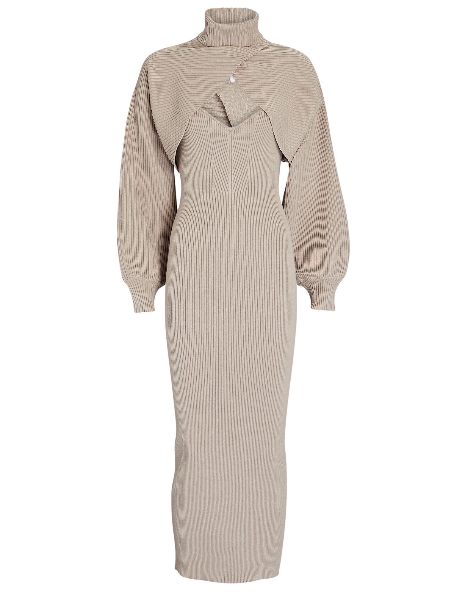 The Ronny Kobo “Lalu” dress appears with a turtleneck top which overlaps to form a sexy cutout detail on the chest. All chic features come together on a comfy ribbed knit material. While this is a bomb must-have, the dress is unfortunately sold out everywhere.