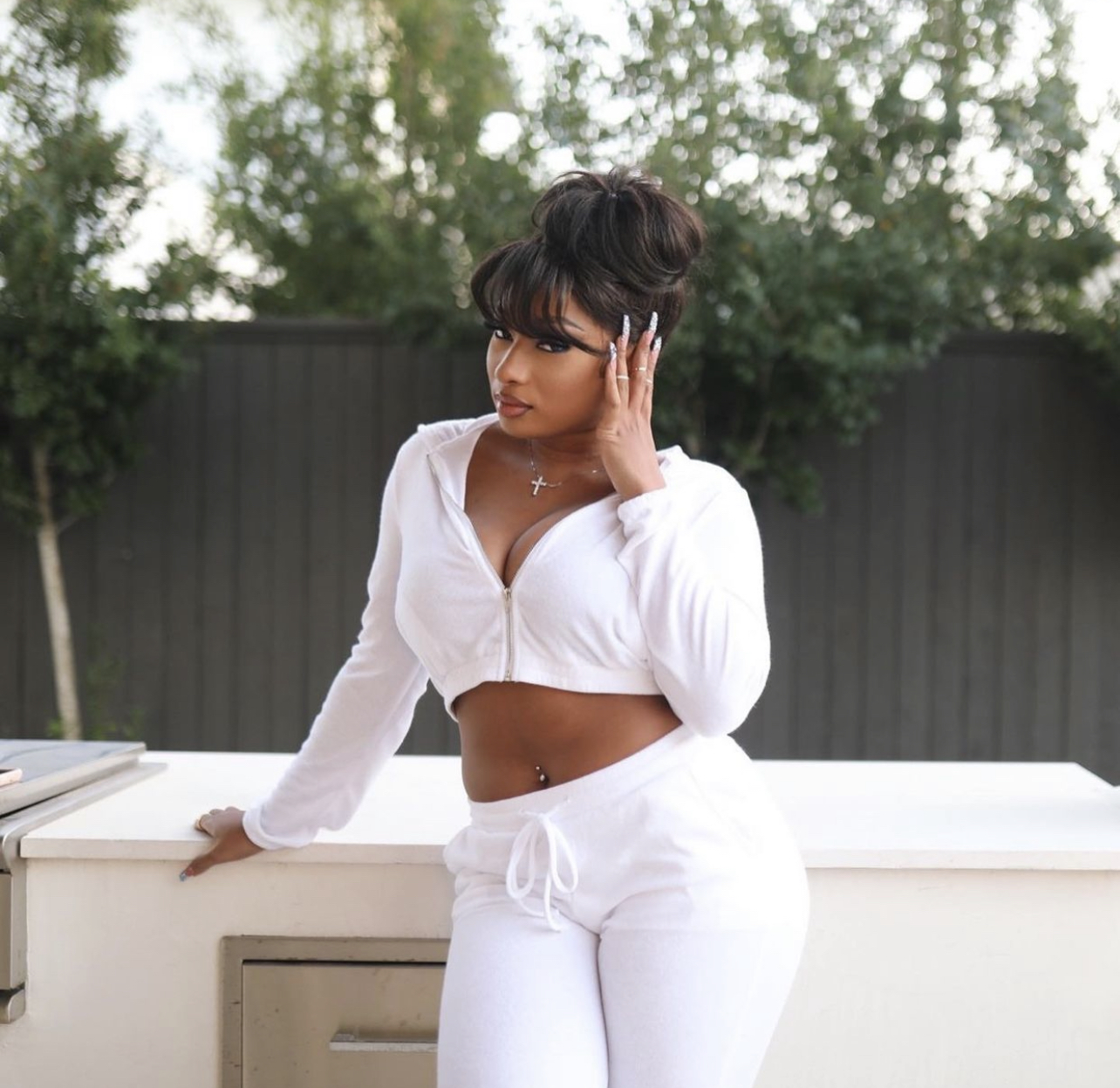 Megan Thee Stallion wore Fashion Nova’s $64.99 Be Yourself 3 Piece Jogger Set in ivory. While Megan only rocked the cropped zip-up hooded jacket and high waisted drawstring joggers, the set also comes with a triangle bralette top.