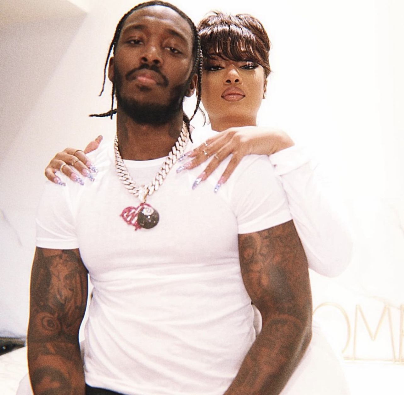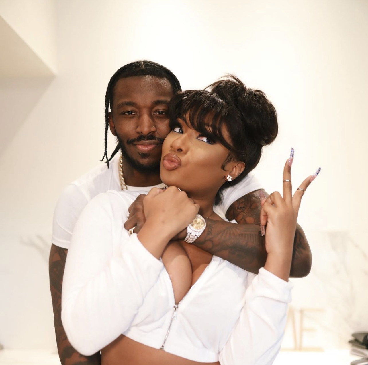 Megan Thee Stallion was spotted getting cozy with her beau Pardi as the two relaxed at home. The Houston rapper was outfitted in a comfy-looking white jogger set from Fashion Nova.