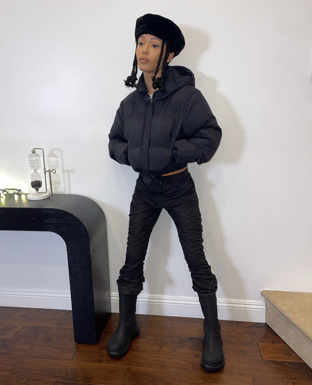 Coi Leray wore Fashion Nova’s $49.99 Can’t Be Beat Cropped Puffer Jacket in black. Continuing the black aesthetic of the look, she paired the puffer with a black beret, ruched cargo trousers, and Balenciaga x Crocs boots.