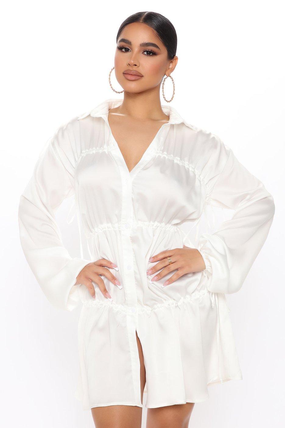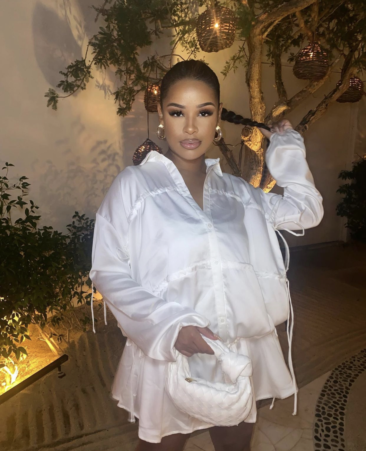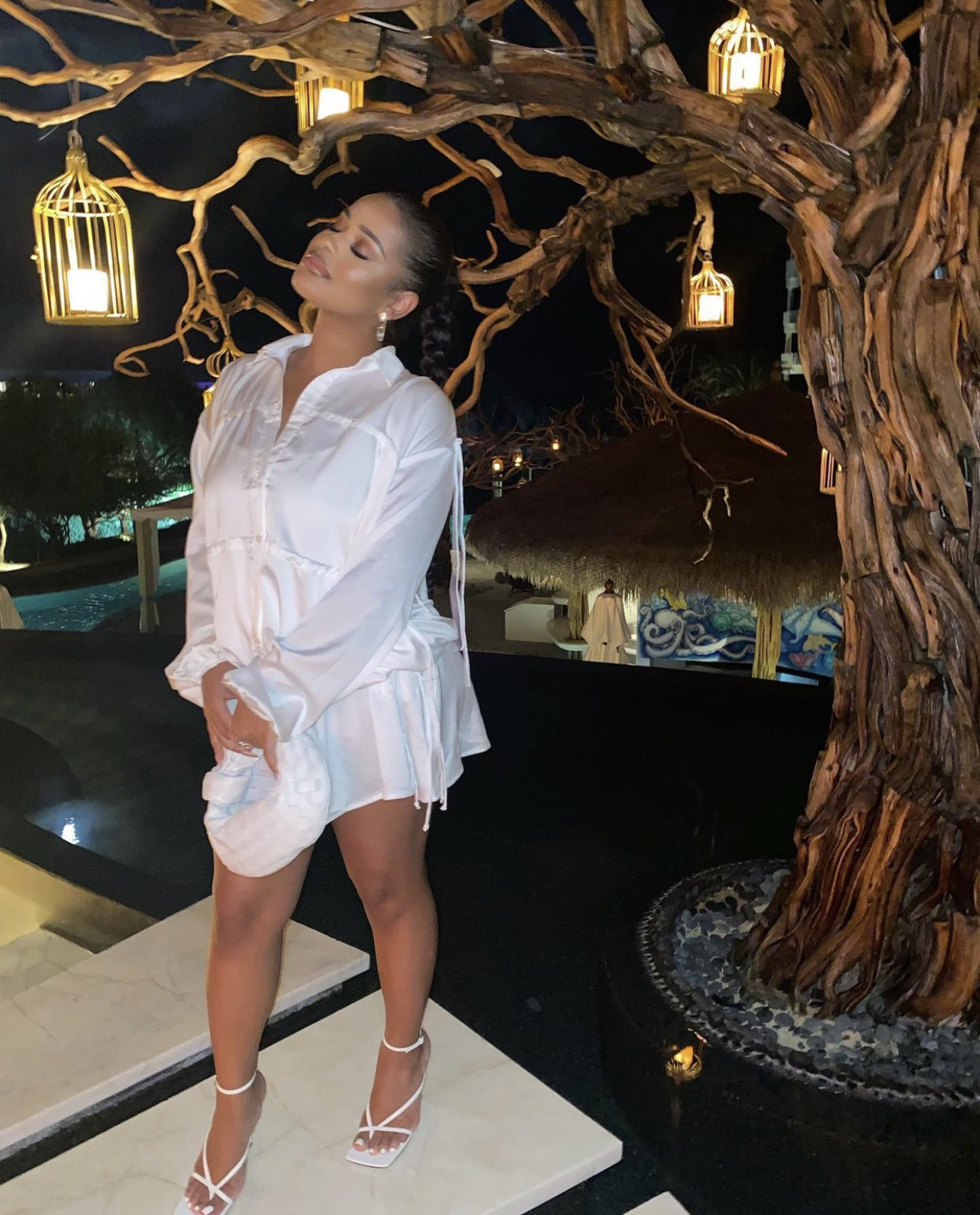 Taina Williams wore Fashion Nova’s $44.99 My Ruched Feels Satin Mini Dress in white. The dress appears with a ruched detailing along with a slightly pleated skirt and dangling adjustable drawstrings. It also features front buttons, a collar, and long sleeves. While Taina wore the white version, the dress also comes in coral and black.