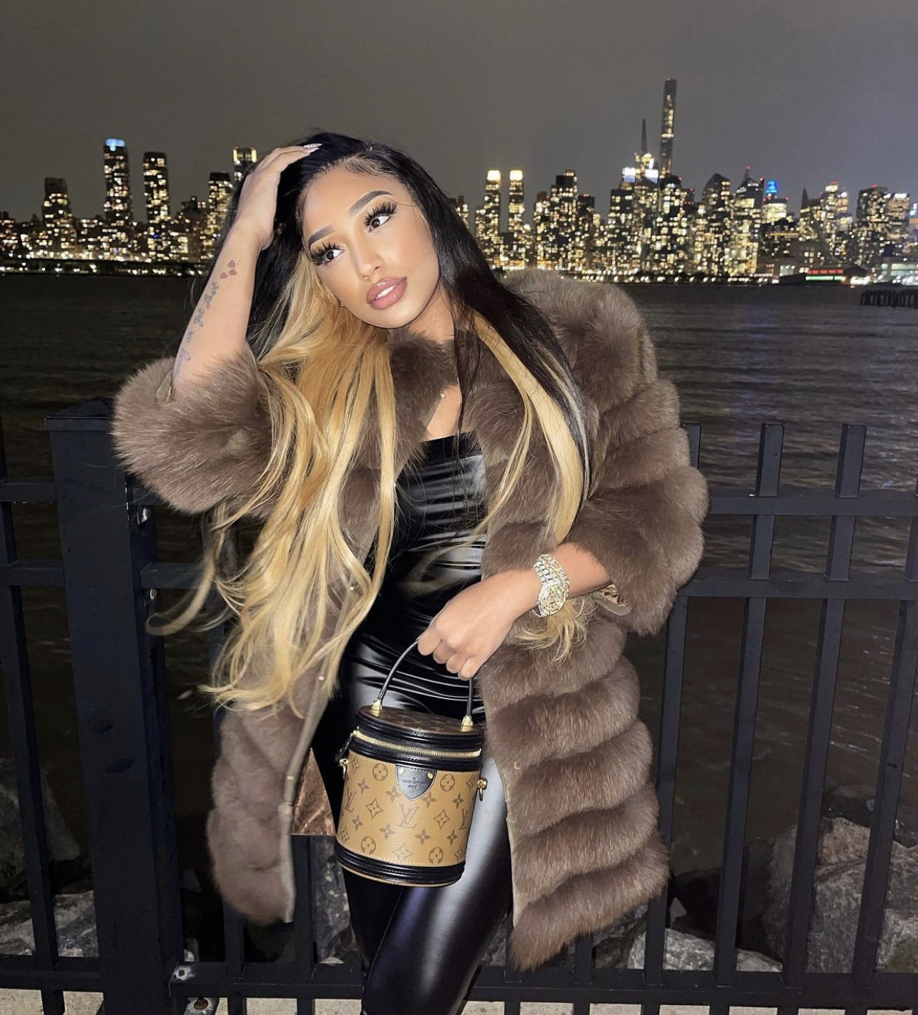 Ella Rodriguez wore Fashion Nova’s $29.99 Buenos Aires PU Jumpsuit in black. She paired the jumpsuit with a brown fur coat along with Louis Vuitton boots and a handbag.