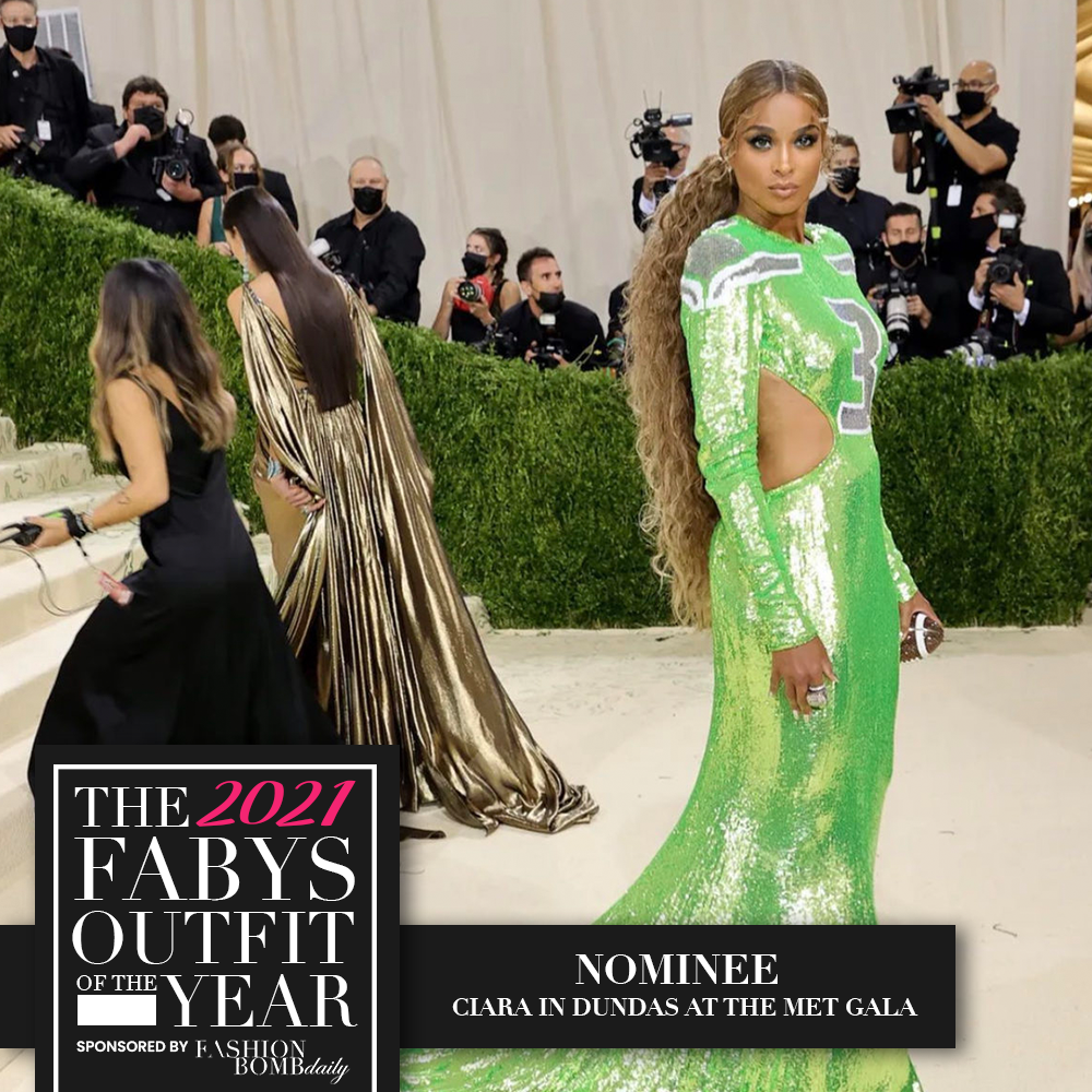 Ciara mesmerized at the 2021 Met Gala in green sequined Dundas gown that paid homage to her hubby, Russell Wilson. Everything down to her football clutch was pure perfection. Her look was styled by our Stylist of the Year nominees Rob Zangardi and Mariel Haenn.