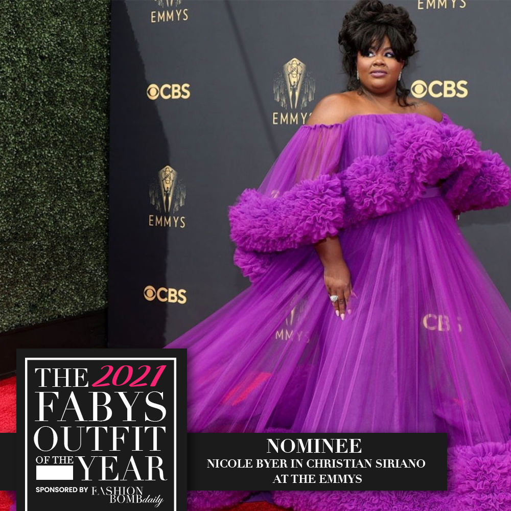 Nicole Byer was a delight wearing a purple gown by Christian Siriano to the 2021 Emmys, styled by Marko Monroe. The rich purple hue of the gown matched with ruffled tulle and off-the-shoulder detail came together for a dreamy red carpet moment. Her classic Hollywood glam hairstyle along with hints of purple in her makeup made for a flawless finish.