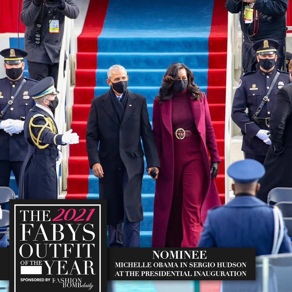 Michelle Obama arrived at the 2021 Presidential Inauguration with Barack Obama and ultimately stole the moment with her stunning red monochromatic ensemble. Styled by Meredith Koop, she donned a full Sergio Hudson look including her coat, sweater, pants, and belt. The look was rounded off with Stuart Weitzman boots, a Christy Rilling face mask, and luscious curls. Oozing of sleek and modern style, this look was such a moment.