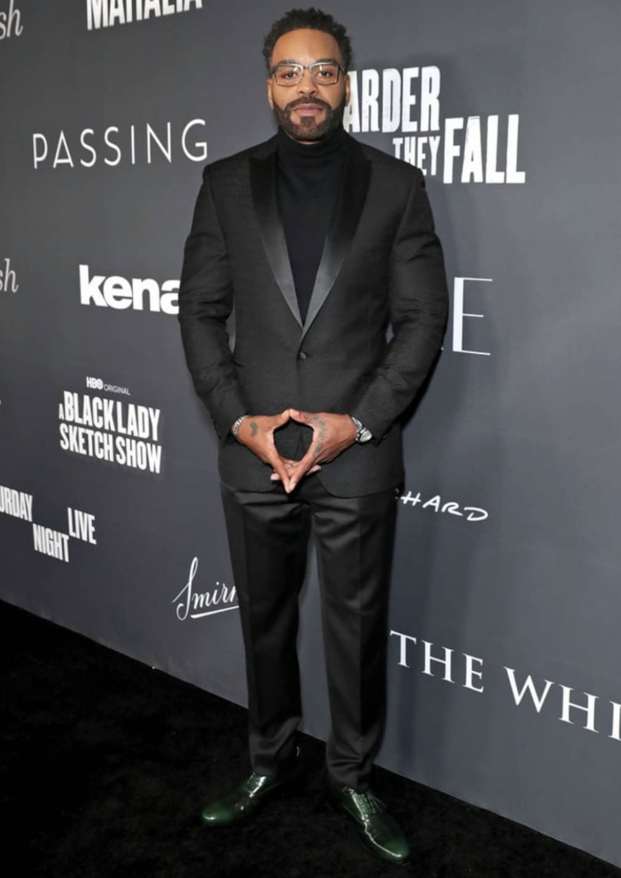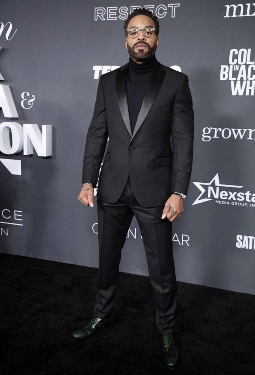 Method Man wore a Reiss black suit including a suit jacket, turtleneck, and trousers. The look was then rounded off with a pair of dark green Scarosso shoes and David Yurman jewelry. His ensemble was styled by Jennifer Austin.