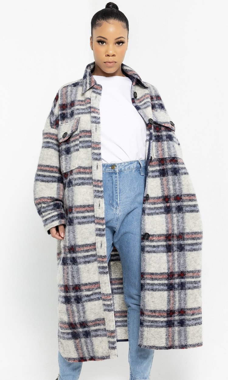 Kyla Pratt wore a white top and blue skinny jeans paired with a $118 Her Favorite Boyfriend Plaid Jacket in grey/red. Rounding off the look, she went with what appeared to be denim pumps.