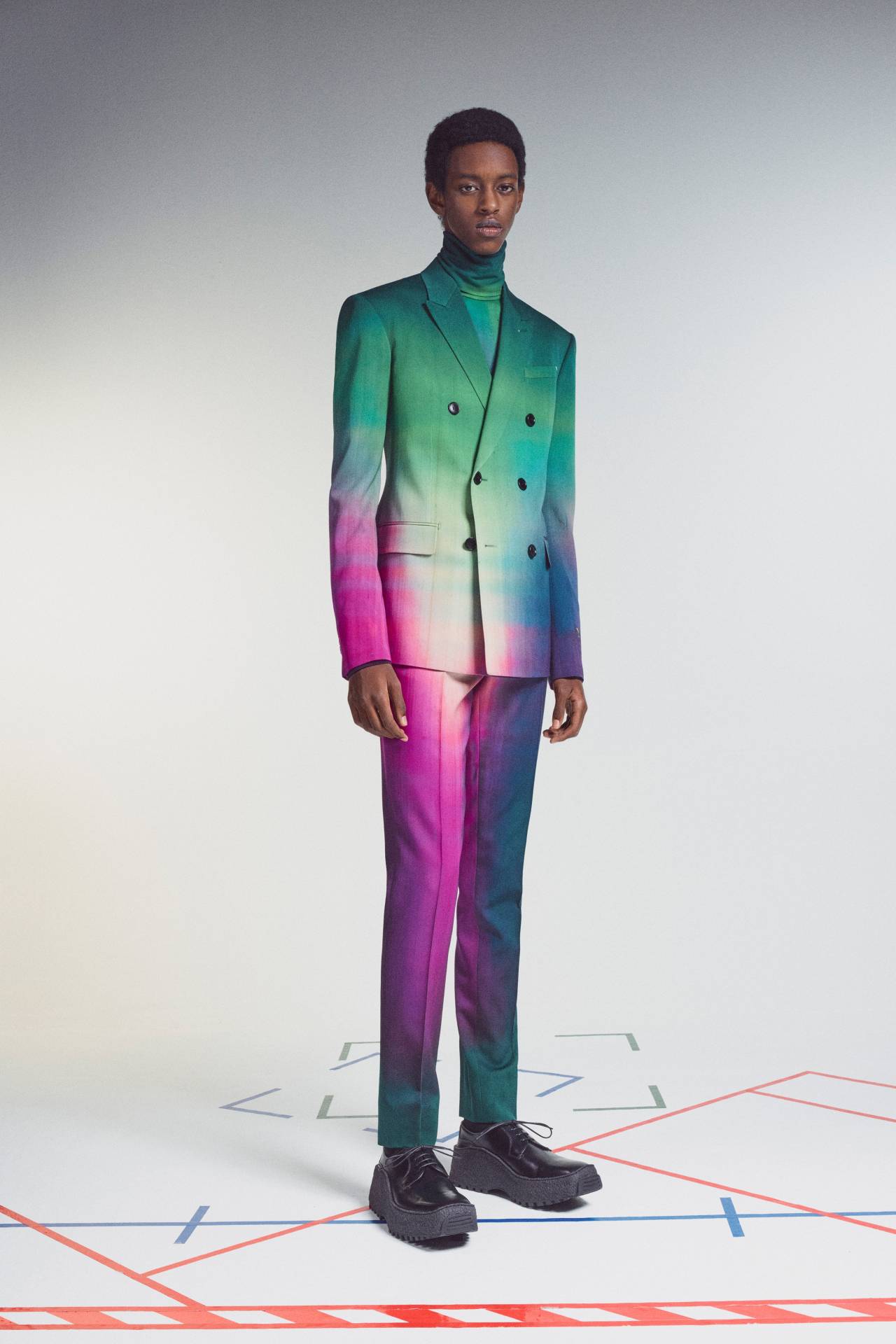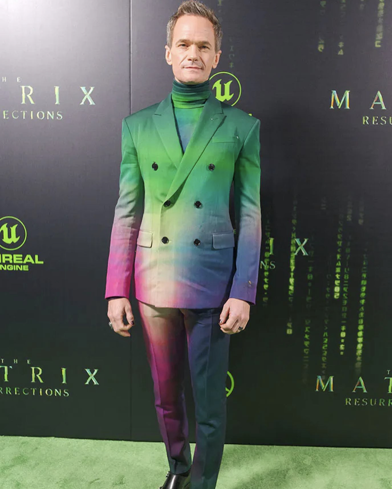 Neil Patrick Harris wore a Berluti Fall 2021 suit and turtleneck, styled by Sam Spector and Fred Kim. He also wore David Yurman jewelry and Christian Louboutin shoes to go along with the multicolor ombré suit.