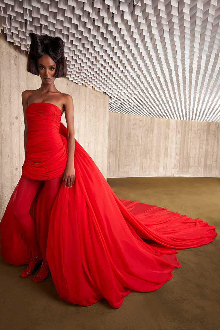 Jada Pinkett Smith wore a red Giambattista Valli Fall/Winter 2021 Couture look, styled by Georgia Medley. The look was competed with Swarovski jewelry and $325 Flor de Maria “Barby” pumps.