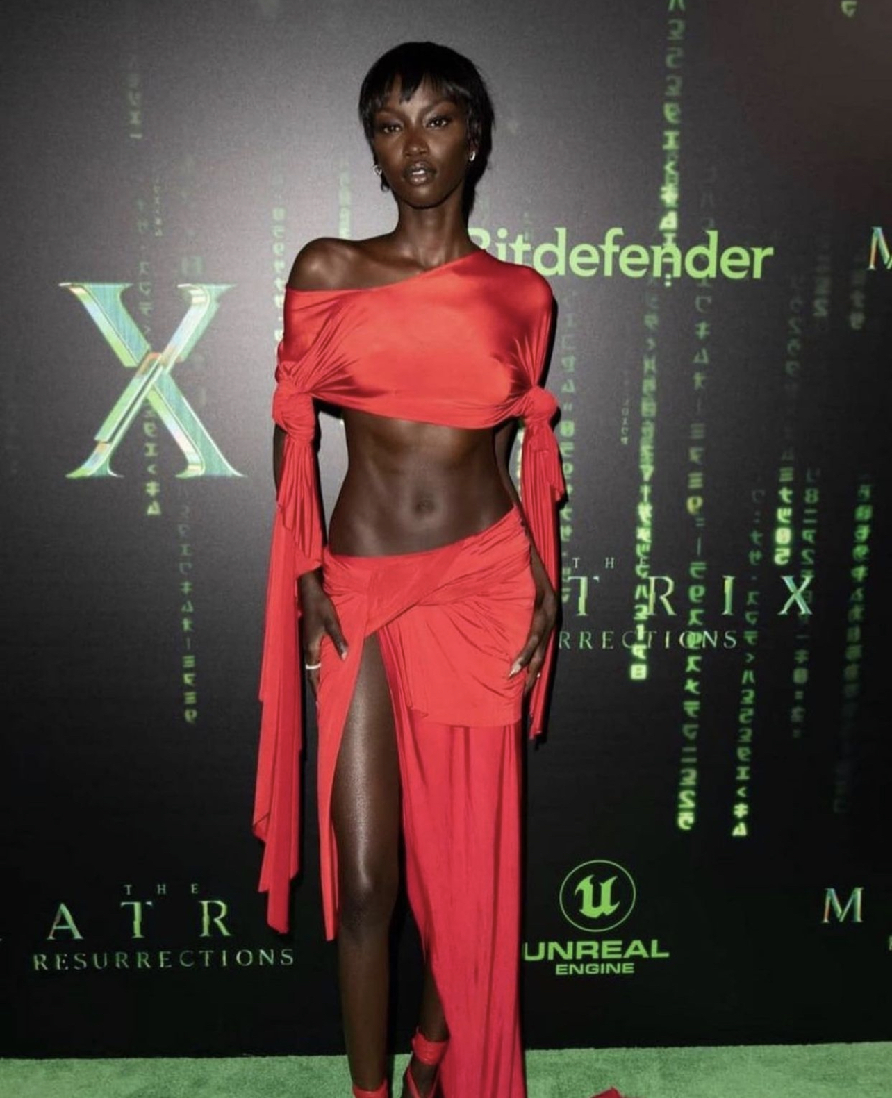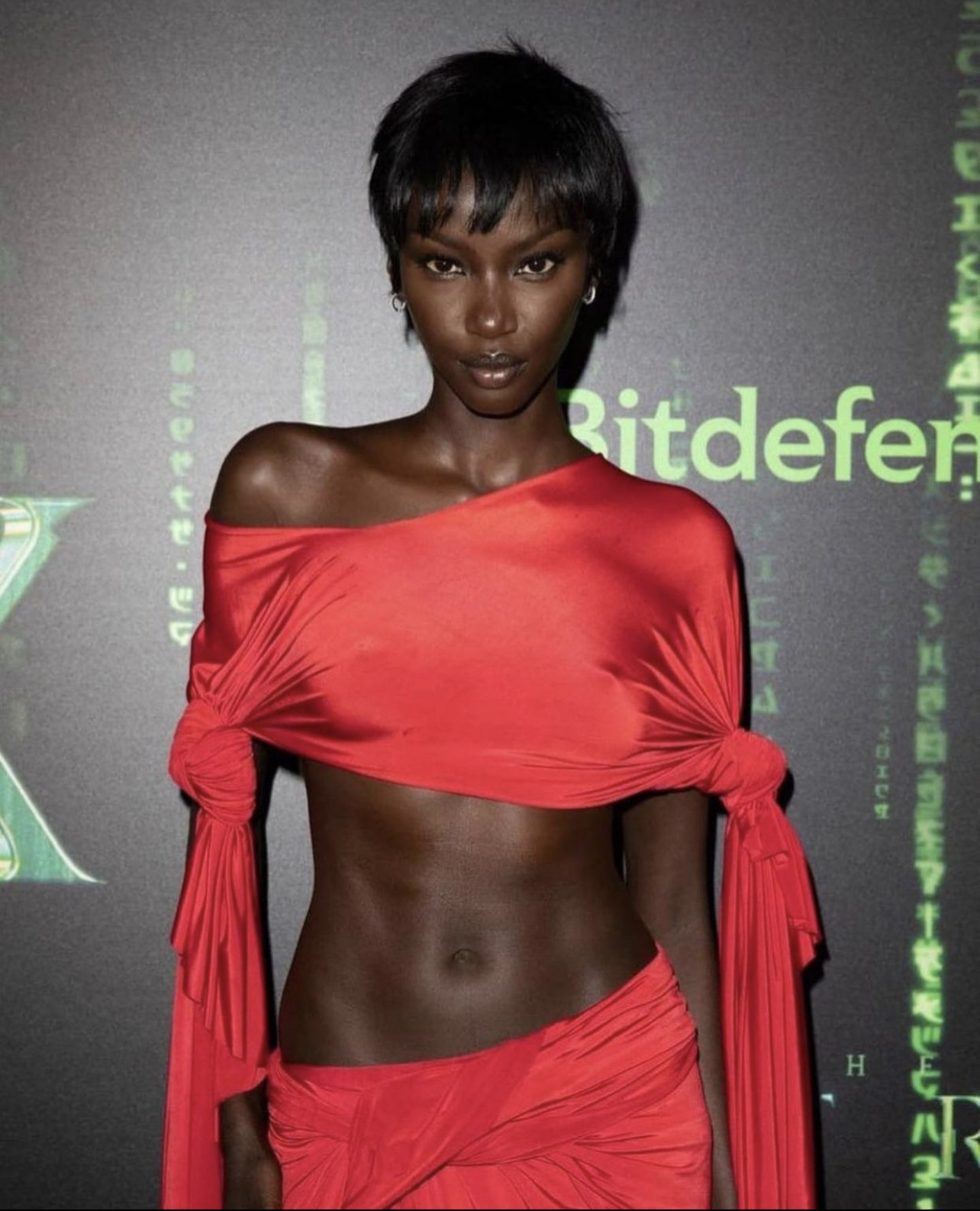Anok Yai wore a Jawara Alleyne x Fashion East red two-piece look, styled by Carlos Nazario.