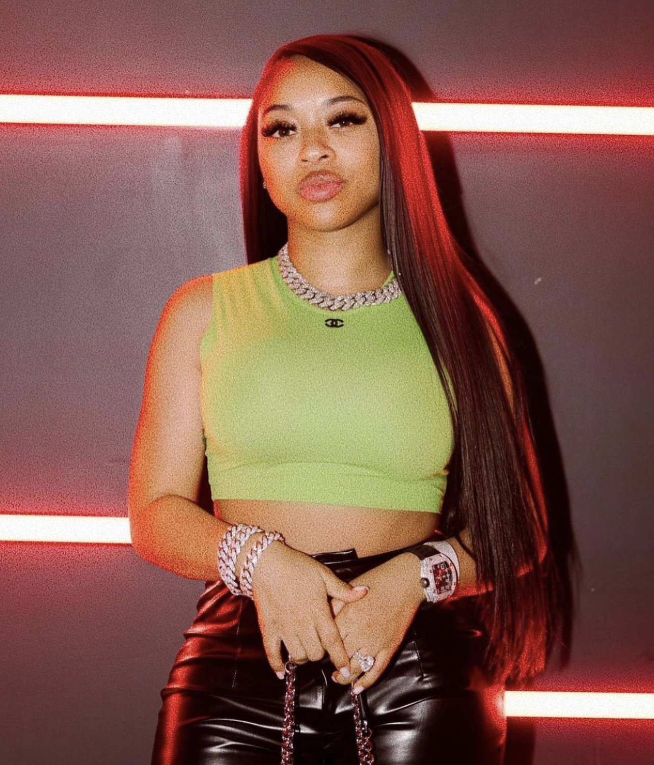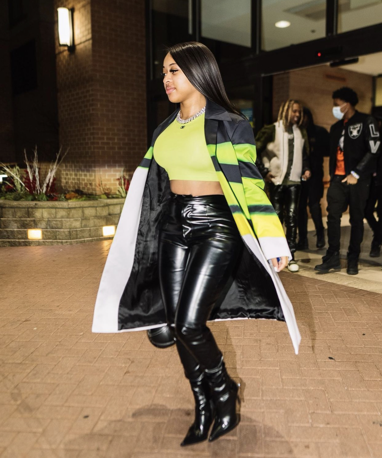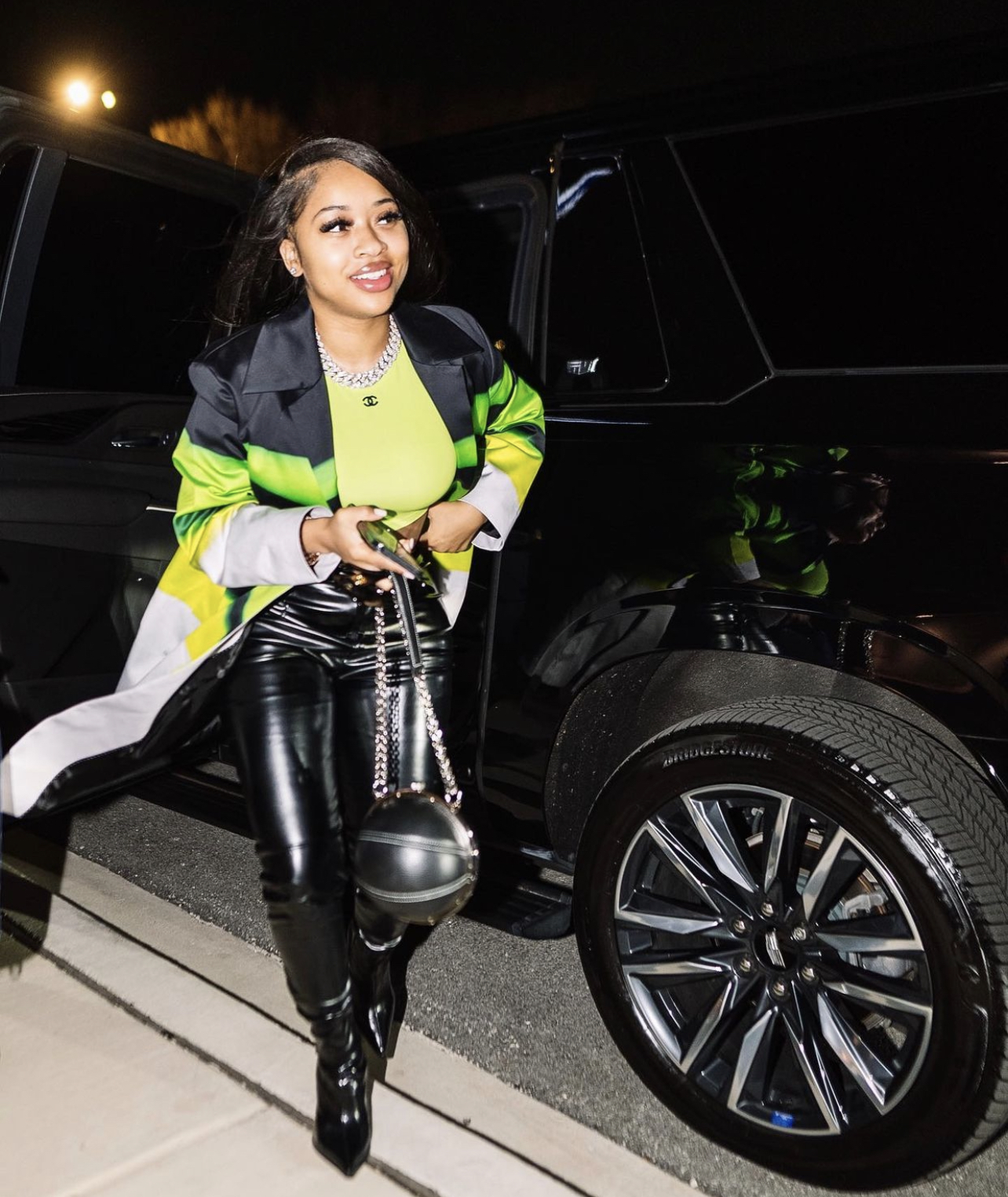 Following her big engagement to now-fiancé and rapper Lil Dark, India Royale stepped out in a stylish look and all smiles. Sticking to a neon green and black color scheme, her outfit included a pair of black leather pants from Fashion Nova.