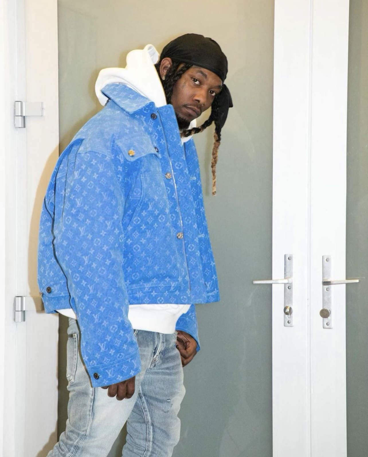 Offset wore a blue Louis Vuitton monogram denim jacket with a white hoodie and jeans. He rounded the look off with Nike Mag “Back to the Future” shoes, which are selling for over $20,000 on StockX.