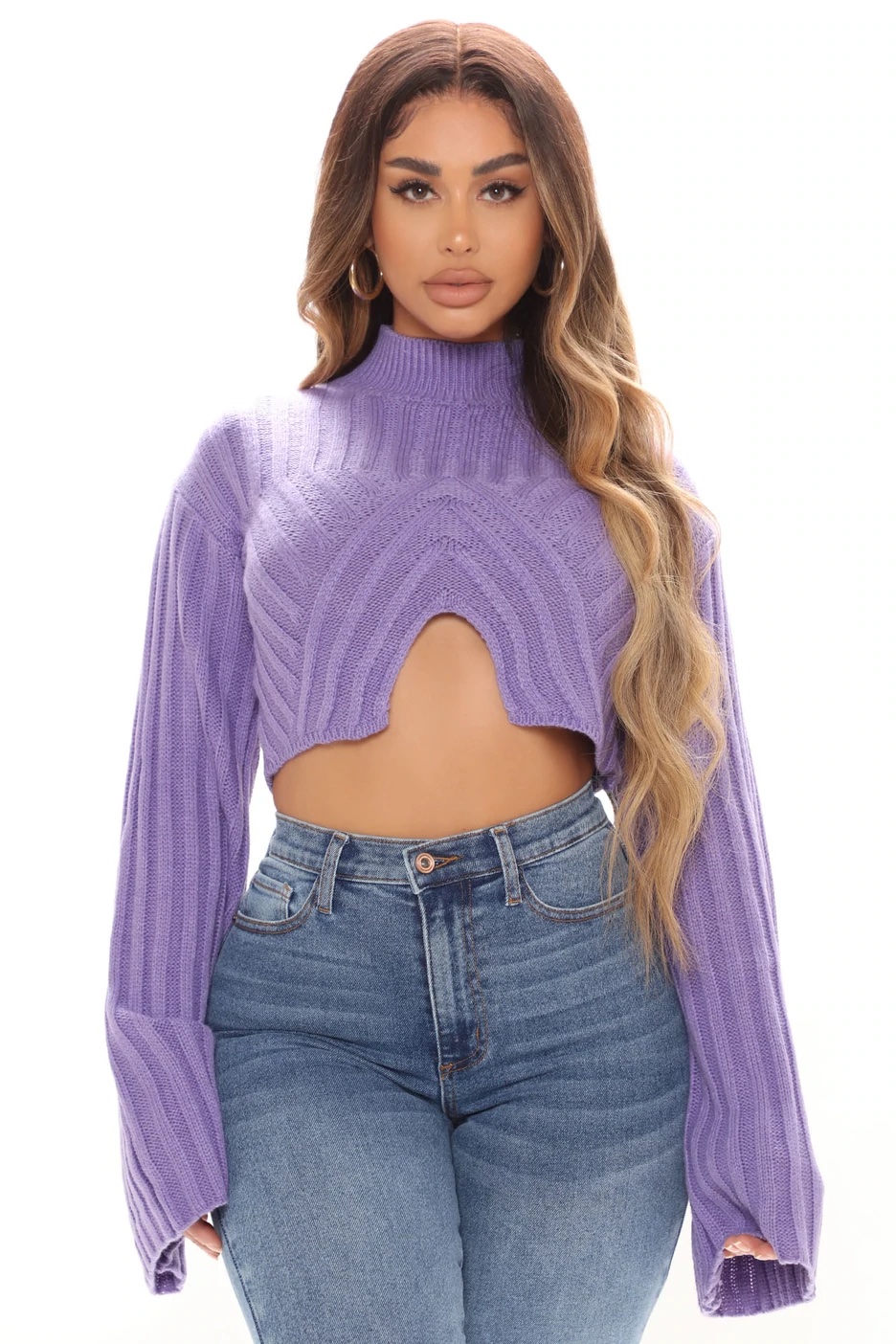 Christina Milian wore Fashion Nova’s $34.99 Self Control Sweater in purple. The purple ribbed knit sweater features a mock neck detail, flared long sleeves, and unique cutout detail. While she wore the purple color, the sweater also comes in orange and black.