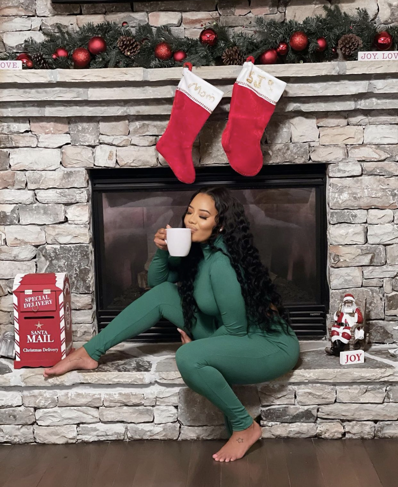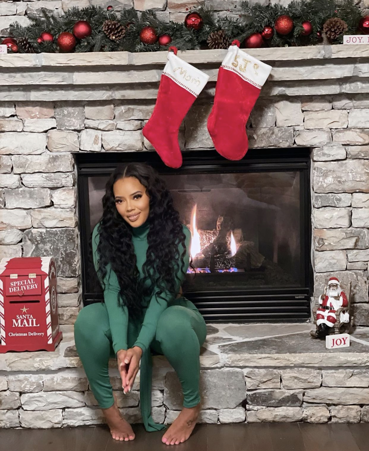 Angela Simmons got in the holiday spirit by participating in some festive activities. Simmons struck a pose in front of a decorated fireplace wearing a green two piece legging set from Fashion Nova.