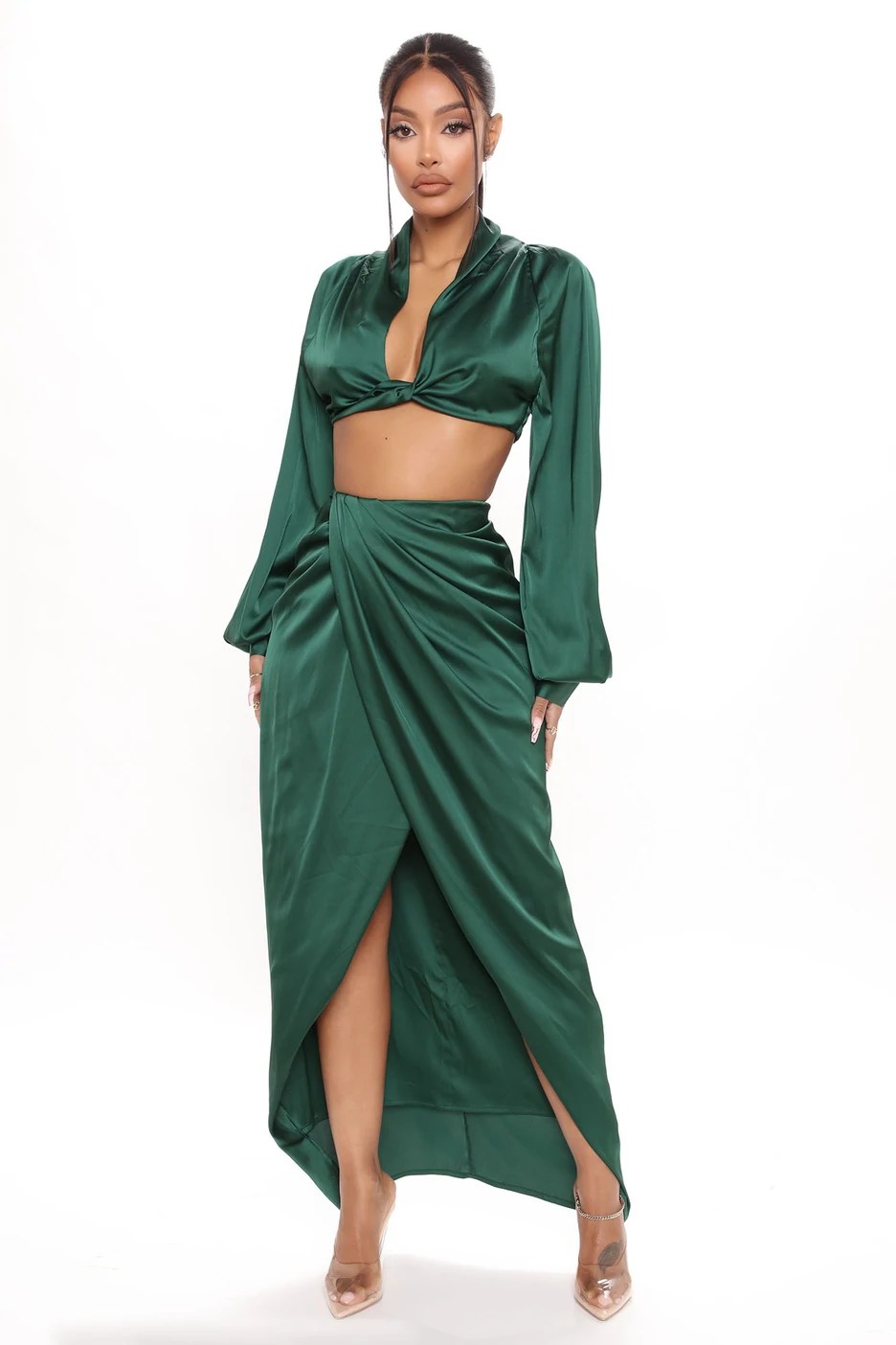Ti Taylor wore Fashion Nova’s $54.99 Love Again Satin Skirt Set in emerald green. The satin set includes a twist front cropped shirt and wrap-over maxi skirt in a dazzling emerald green. Also, the set comes in hot pink as a second color option.