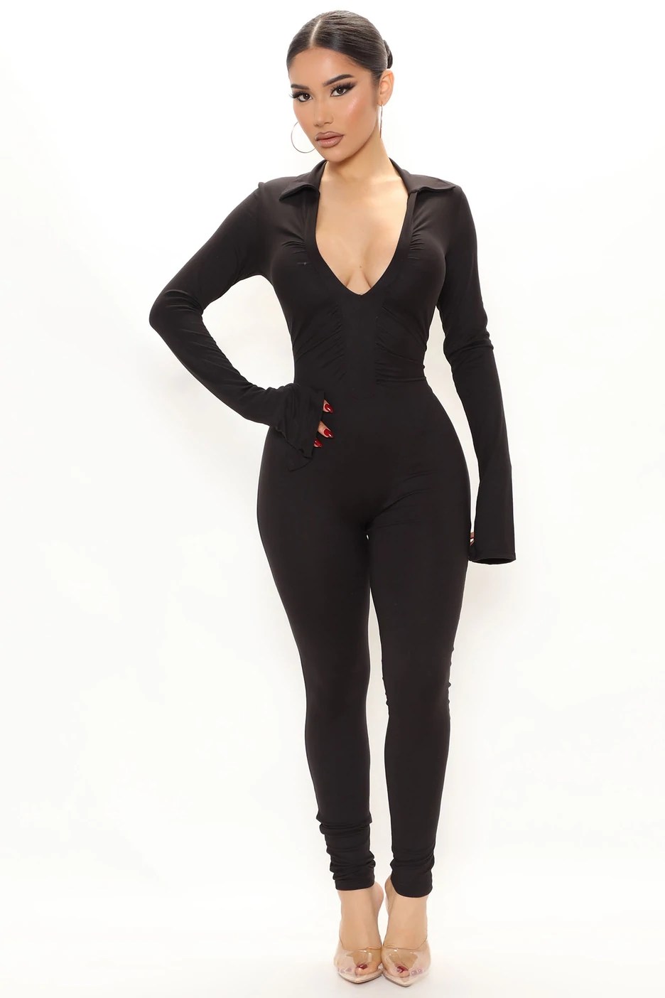 Jordyn Woods wore Fashion Nova’s $39.99 Come As You Are Jumpsuit in black. This piece is not your basic jumpsuit as it consists of a chic collar, ruched detailing, plunging v-neckline and split long sleeves. Also, it comes in black and rust as color options.