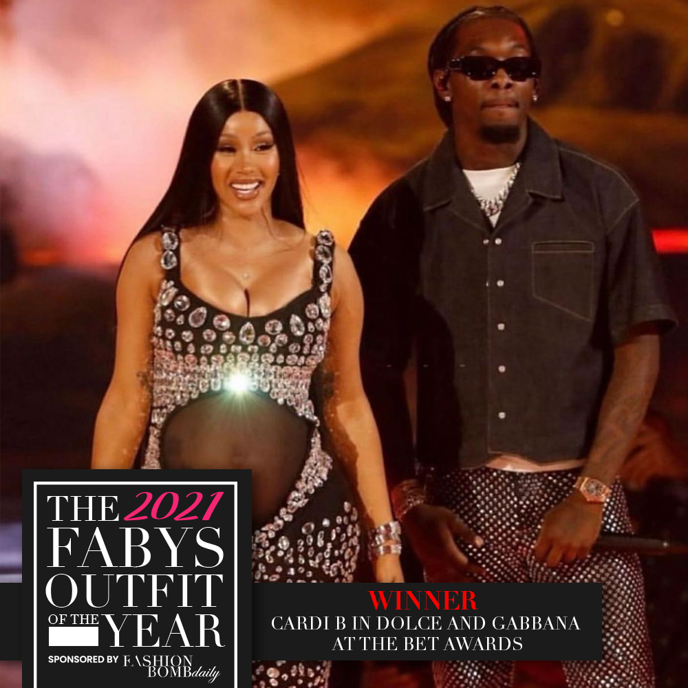 Cardi B’s Dolce and Gabbana crystal-adorned bodysuit at the 2021 BET Awards is the winner for 2021 Outfit of the Year. This was such an iconic moment when the rapper announced her second pregnancy in this dazzling look.