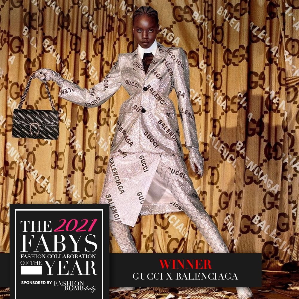 Formulating the biggest luxury mashup of the year, Gucci and Balenciaga reign supreme as our 2021 Fabys Collaboration of the Year. Together, the fashion labels delivered all the drama and glam with crystals, vibrant prints, and ultra-logomania.