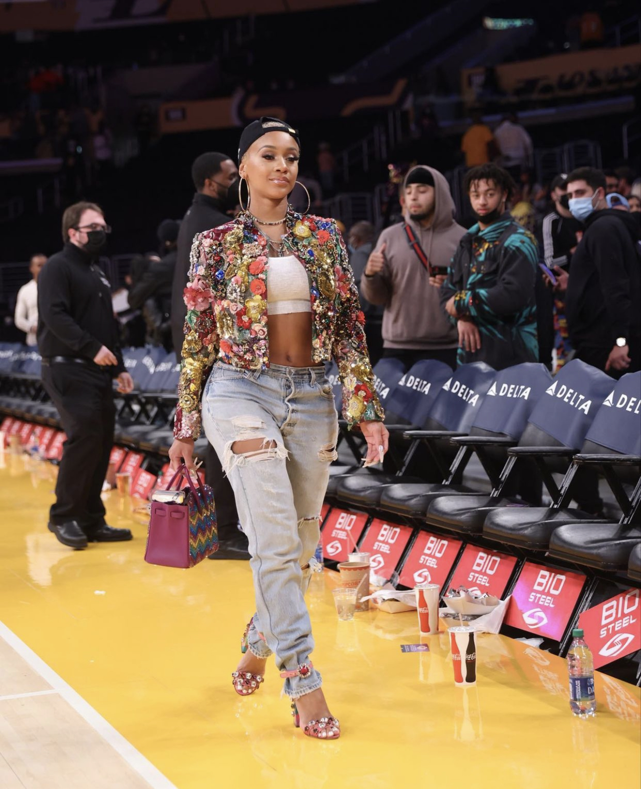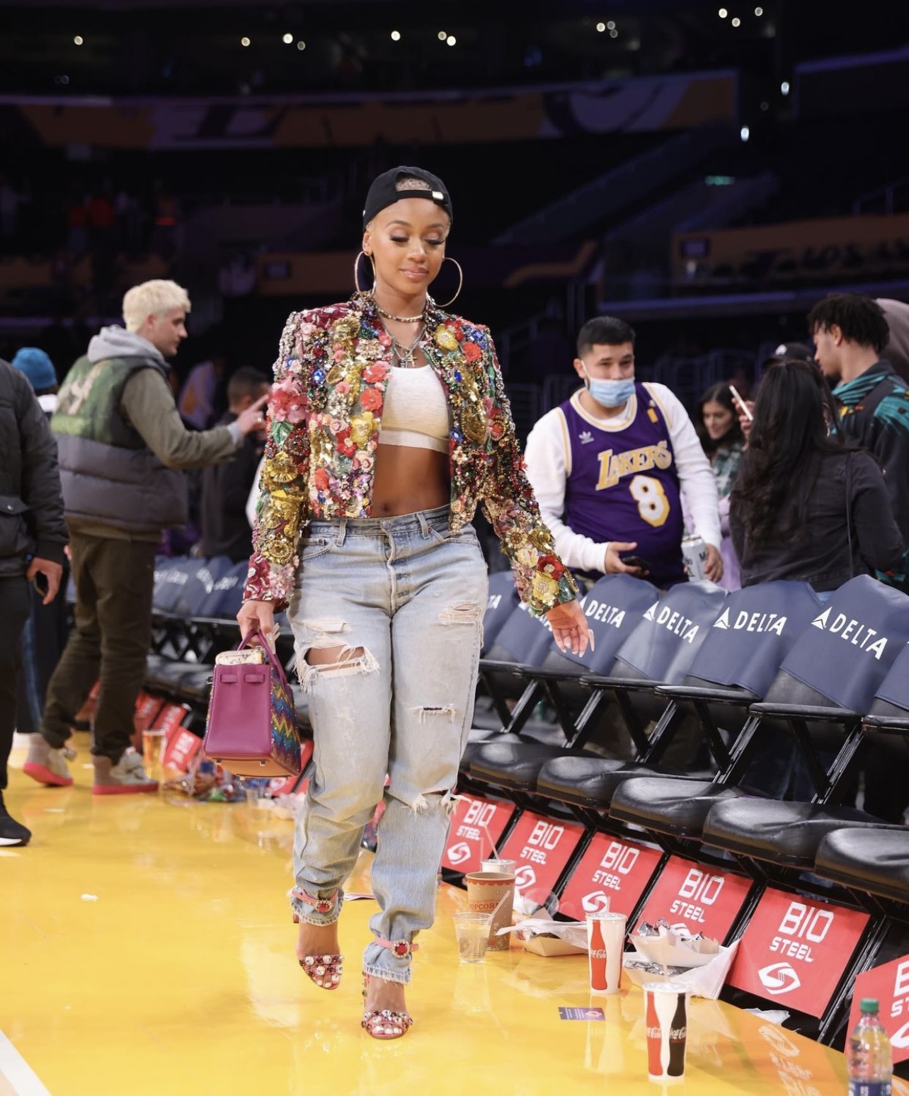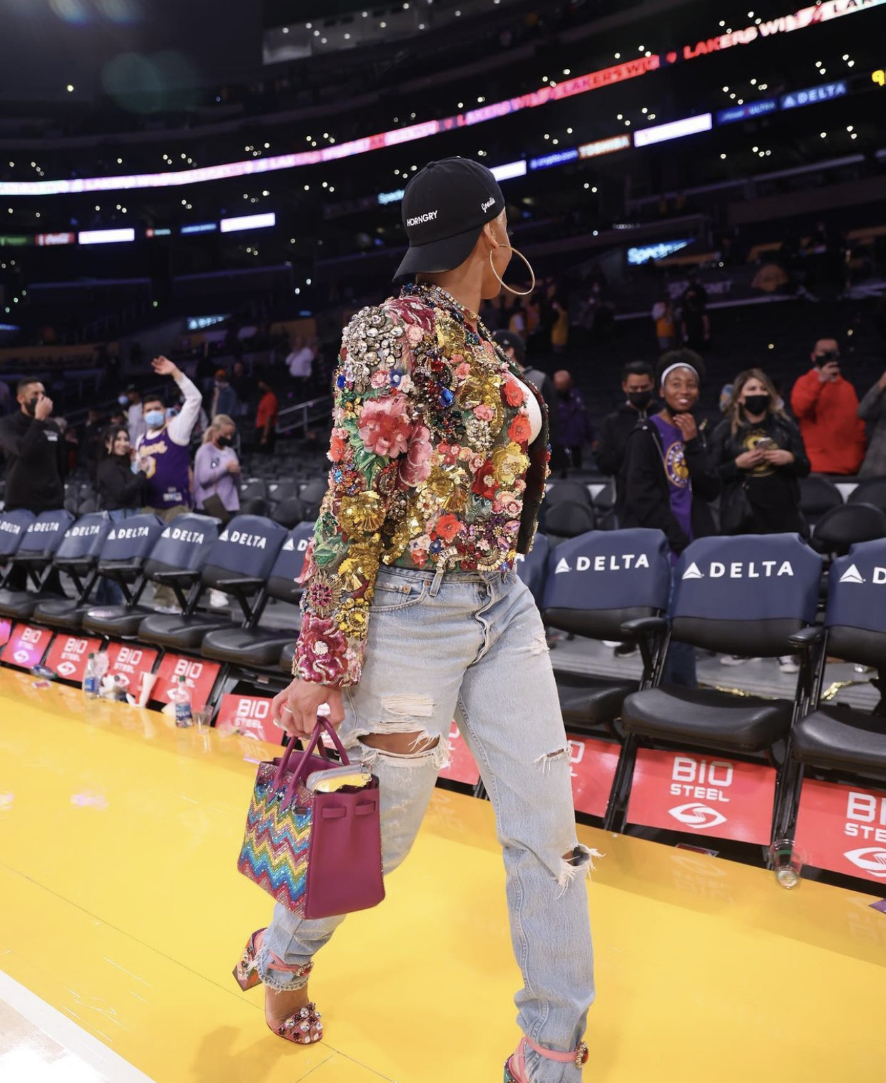 Saweetie attended the Lakers vs. Timberwolves game in LA wearing a Dolce and Gabbana embellished sequin jacket and “Keira” pink crystal-adorned heeled sandals. She paired her Dolce and Gabbana pieces with a white crop top, blue distressed jeans, crystalized Hermès Birkin bag, large gold hoop earrings and Goodie “Horngry” hat.
