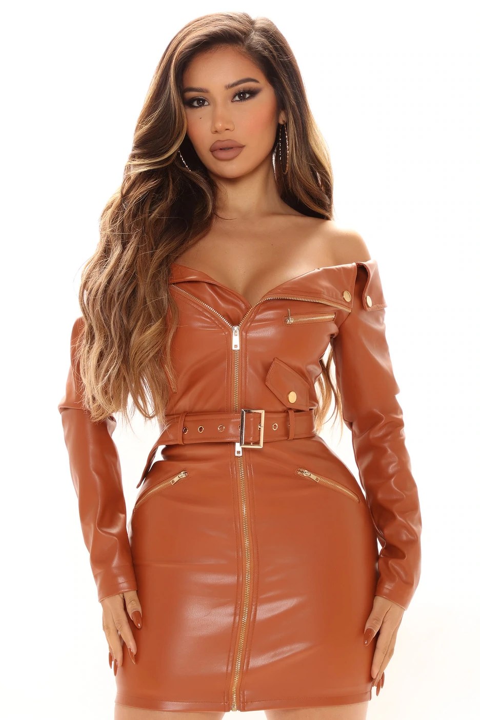 Erica Mena wore Fashion Nova’s $69.99 Worst Behavior Faux Leather Skirt Set in cognac. The set includes an off-the-shoulder top and mini skirt complete with a belt and zipper details.