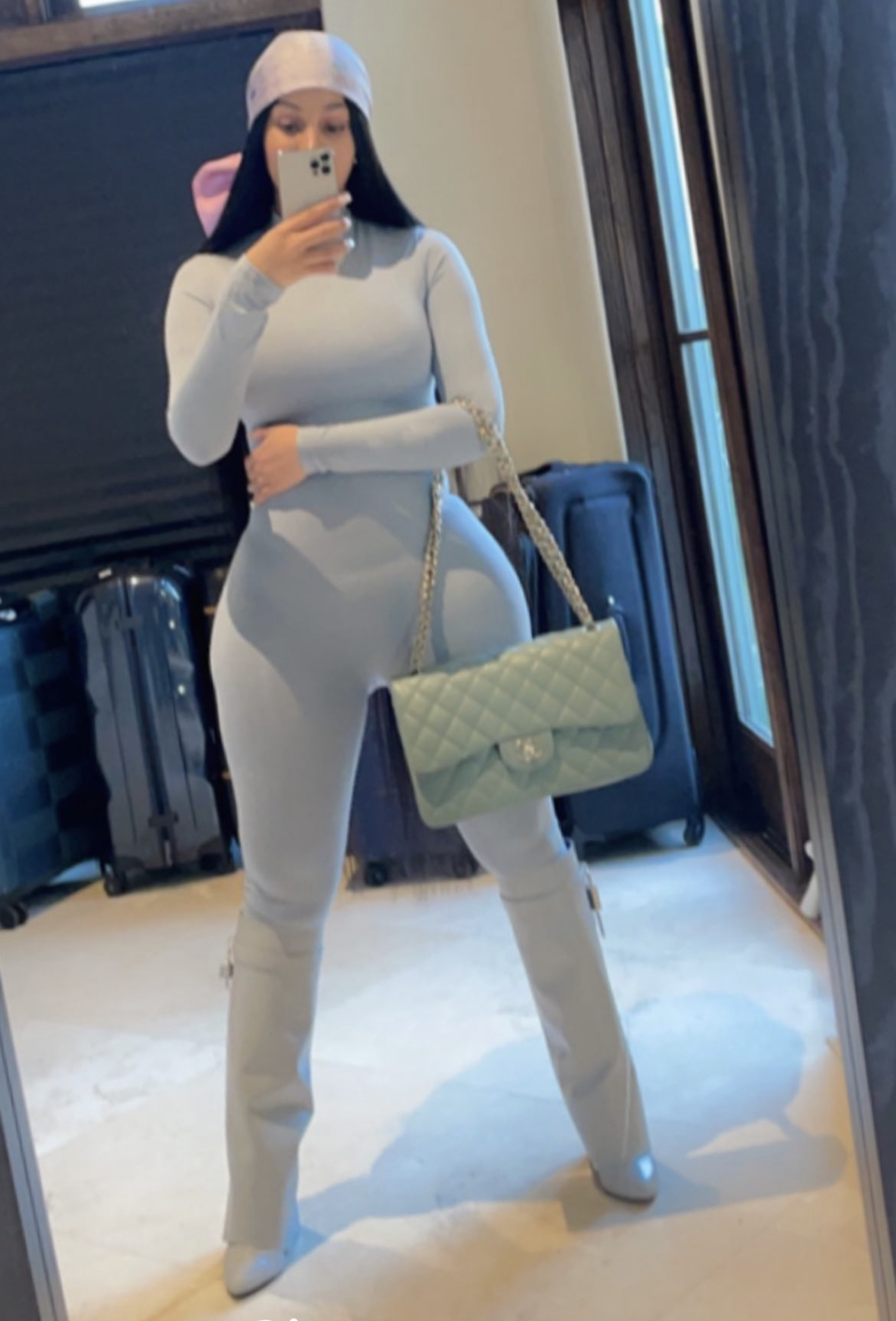 Cardi B wore a $69.99 JLUXLABEL BODYBASIX Asha high neck jumpsuit paired with $2,295 Givenchy Shark Lock boots. For her other accessories, she went with a Chanel pink silk headscarf and mint green flap bag.
