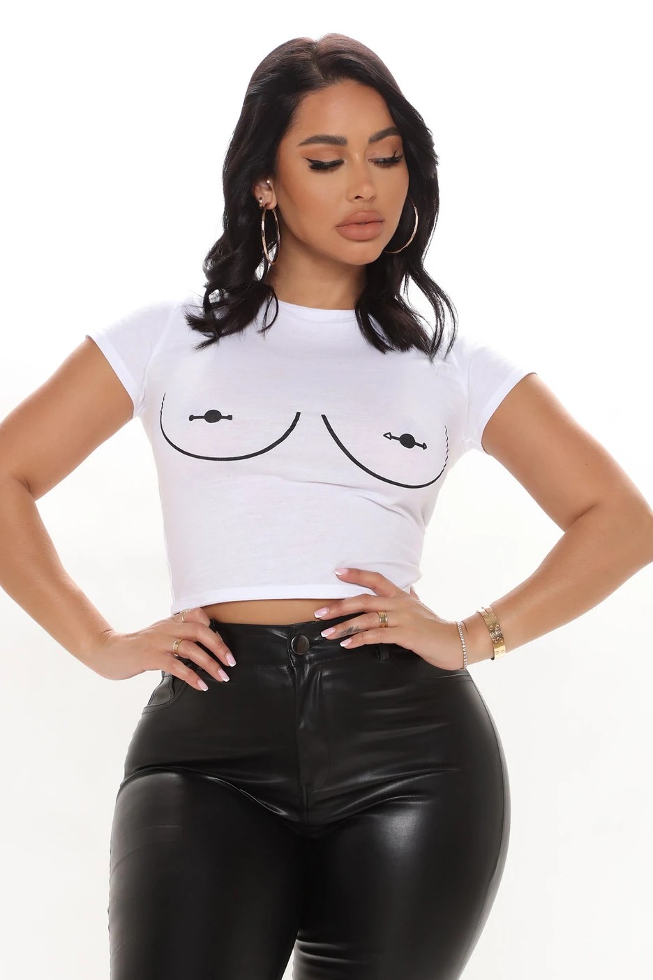 Megan Thee Stallion wore Fashion Nova’s $19.99 Free The Tits Top in white. The cropped t-shirt appears with short sleeves matched with a boob graphic. It also offers immense stretch and hugs the body for the perfect fit.
