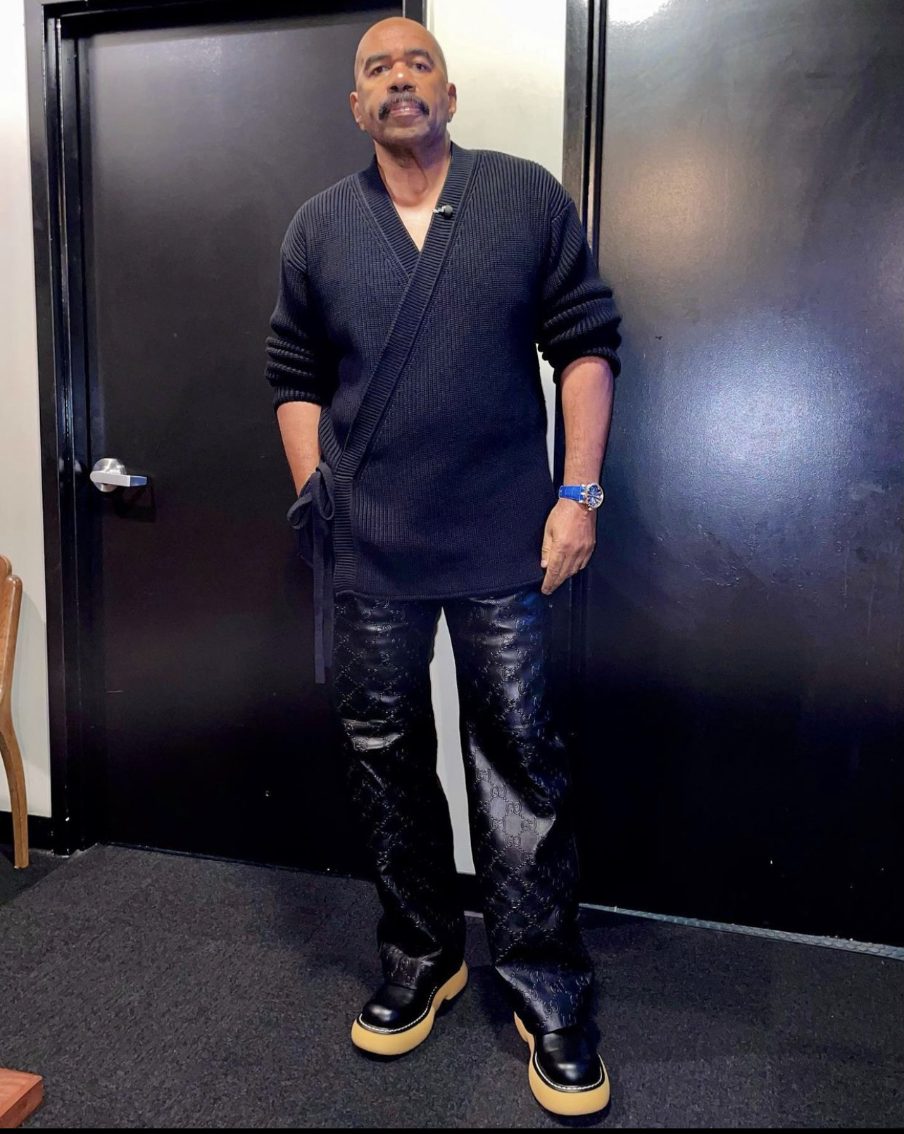 Steve Harvey wore a $1,295 Dunhill cotton texture wrap cardigan paired with $4,600 Gucci GG leather pants and what appears to be $1,100 Bottega Veneta “Swell” boots. His look was styled by Elly Karamoh, our 2021 Faby’s Stylist of the Year.