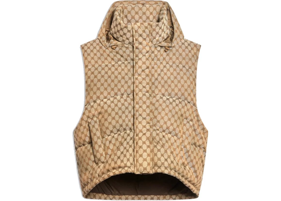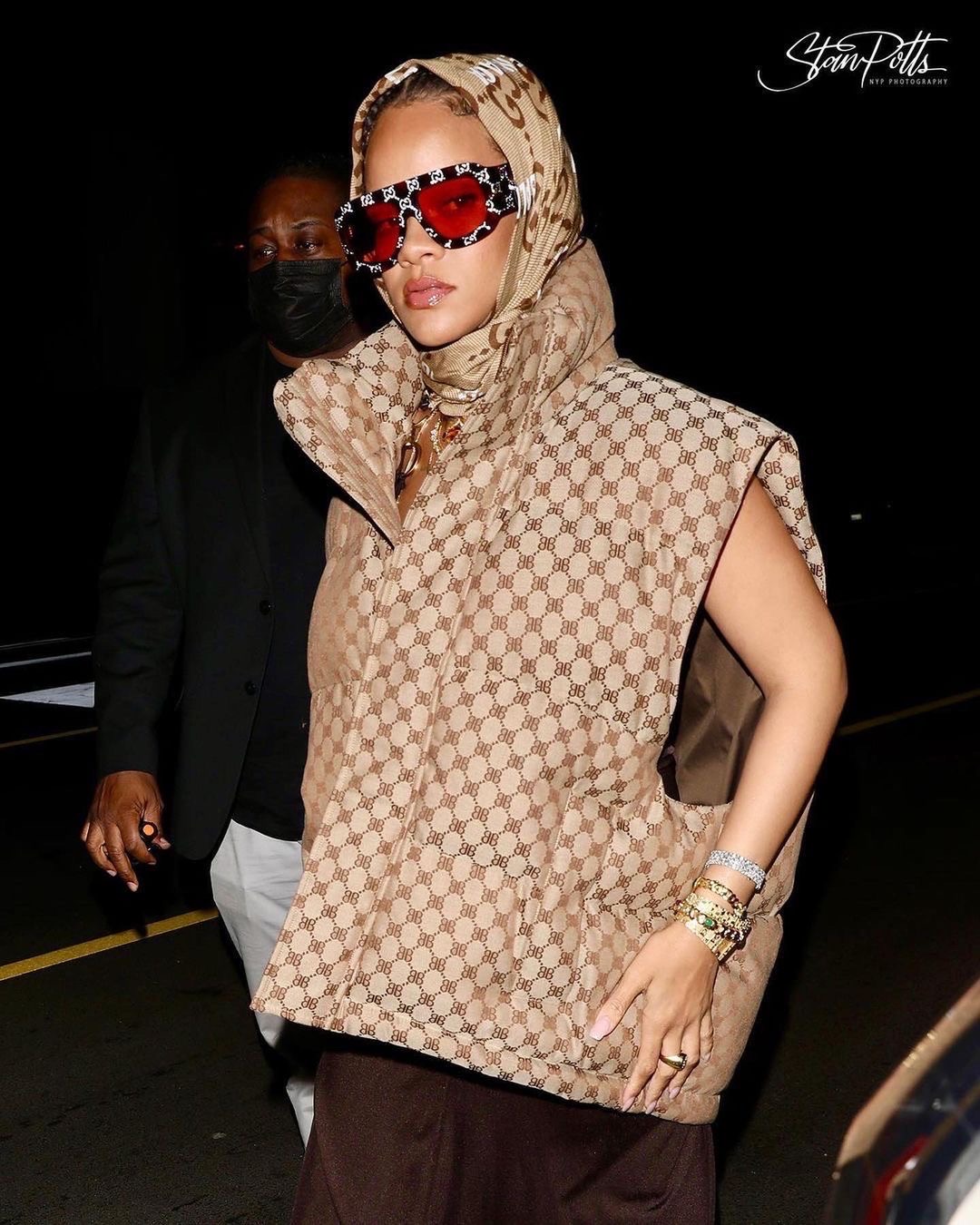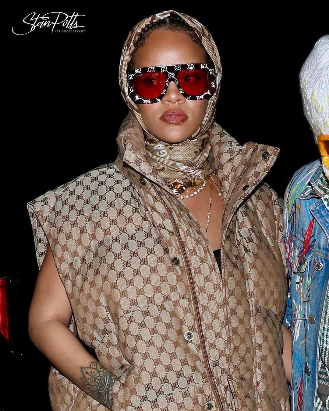 Rihanna wore a $2,500 Gucci x Balenciaga gilet and $550 maxi GG print silk shawl, worn as a head scarf, from the brands’ Hacker Project. Underneath her vest, it appeared the Fenty CEO was wearing a brown flowy dress. Rounding off the look, she completed the look with sold-out $1,290 Tom Ford Padlock snakeskin sandals and $870 Gucci oversize rectangular sunglasses.
