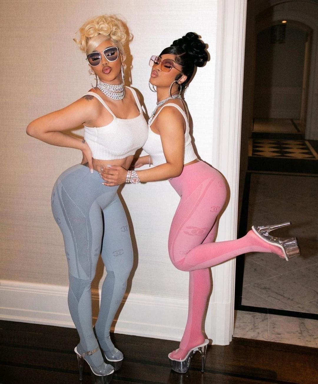 Cardi B and sister Hennessy Carolina posed for a cute sister sister shoot by Tomas Herold wearing Chanel leggings and $30 Giant Crystal Hoops by BeautyLifeFun Shop designer SybgCo: