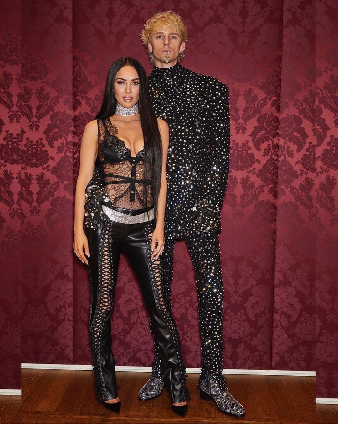 While Machine Gun sparkled in studs and crystals, Megan skewed soft and feminine in a lace bodysuit, crystal accessories, and lace up leather pants.