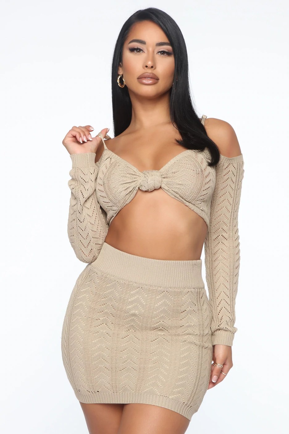 Alexis Skyy wore Fashion Nova’s $44.99 Mayra Skirt Set in taupe. The set features an off-shoulder knotted twist-front top and high waist mini skirt in a sweater knit material. Also, sizes range up to XL for this co-ord.