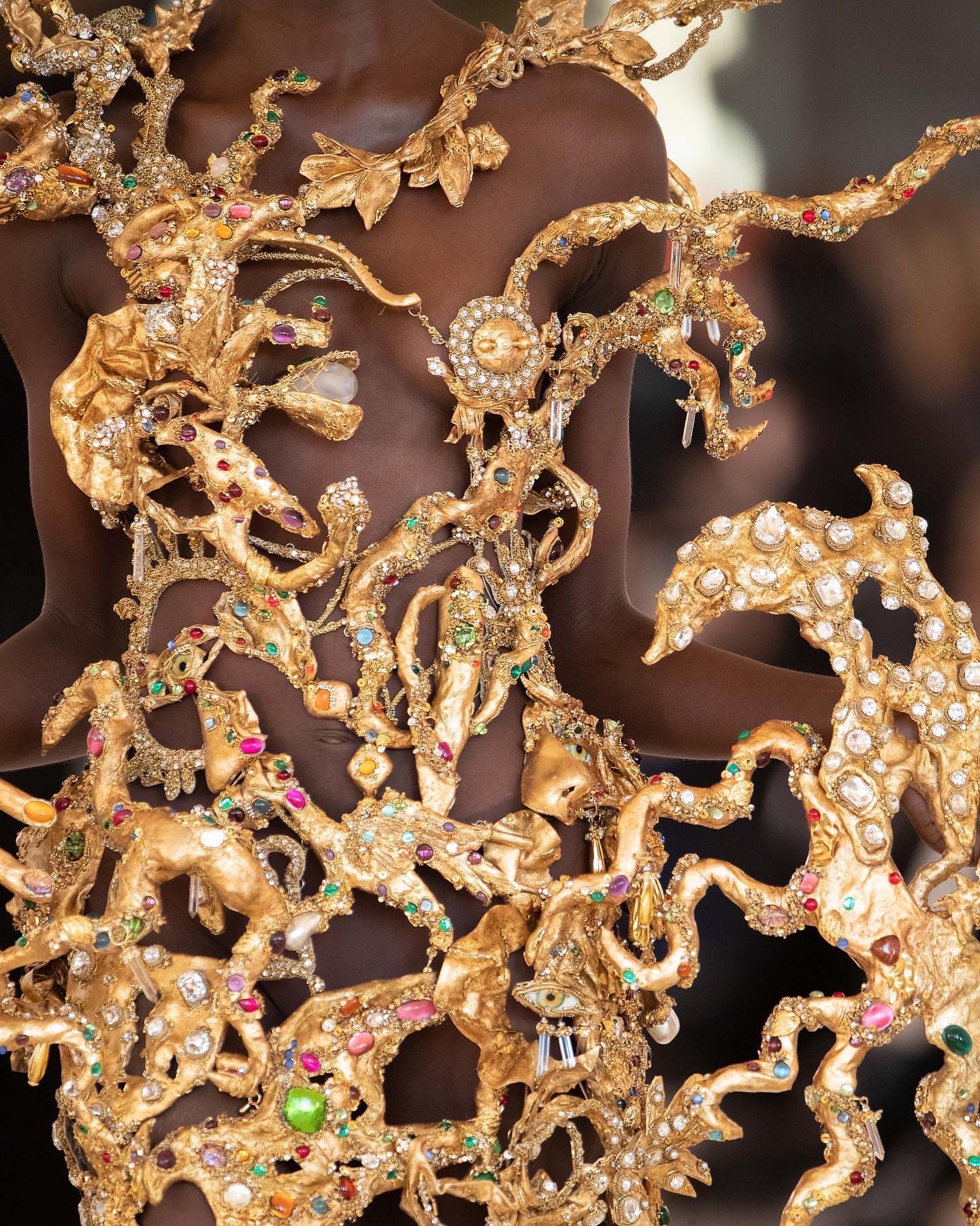 Lastly, get into the details of this glorious gilded piece, which can either be worn on a red carpet or hung up on a wall as a masterpiece. Cardi B or Katy Perry would kill this look.
