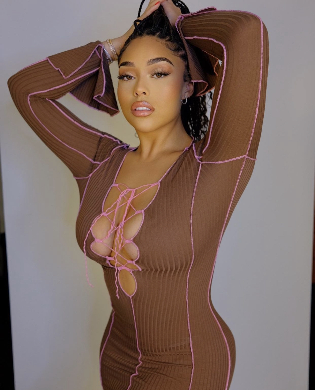 Jordyn Woods is always bringing the heat with her head-turning looks. She recently posed in a brown and pink contrasting seam lace-up mini dress from Fashion Nova. Discover how to achieve her look below: