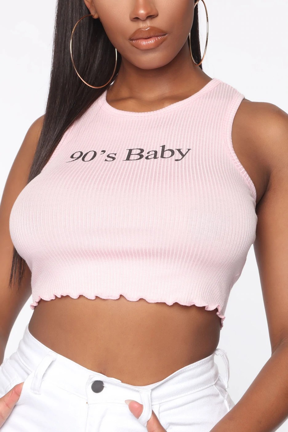The 90’s Baby Tank Top appears as a ribbed racerback tank top in pink with a lettuce-edge hem. Rounding off the top, the words “90’s baby” graces the front.