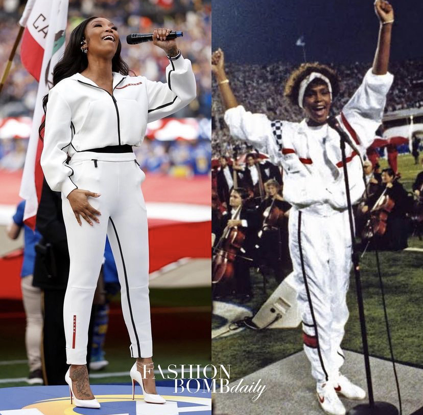 Her look is an homage to Whitney Houston’s epic National Anthem performance. Both ladies looked splendid, bathed in angelic white.