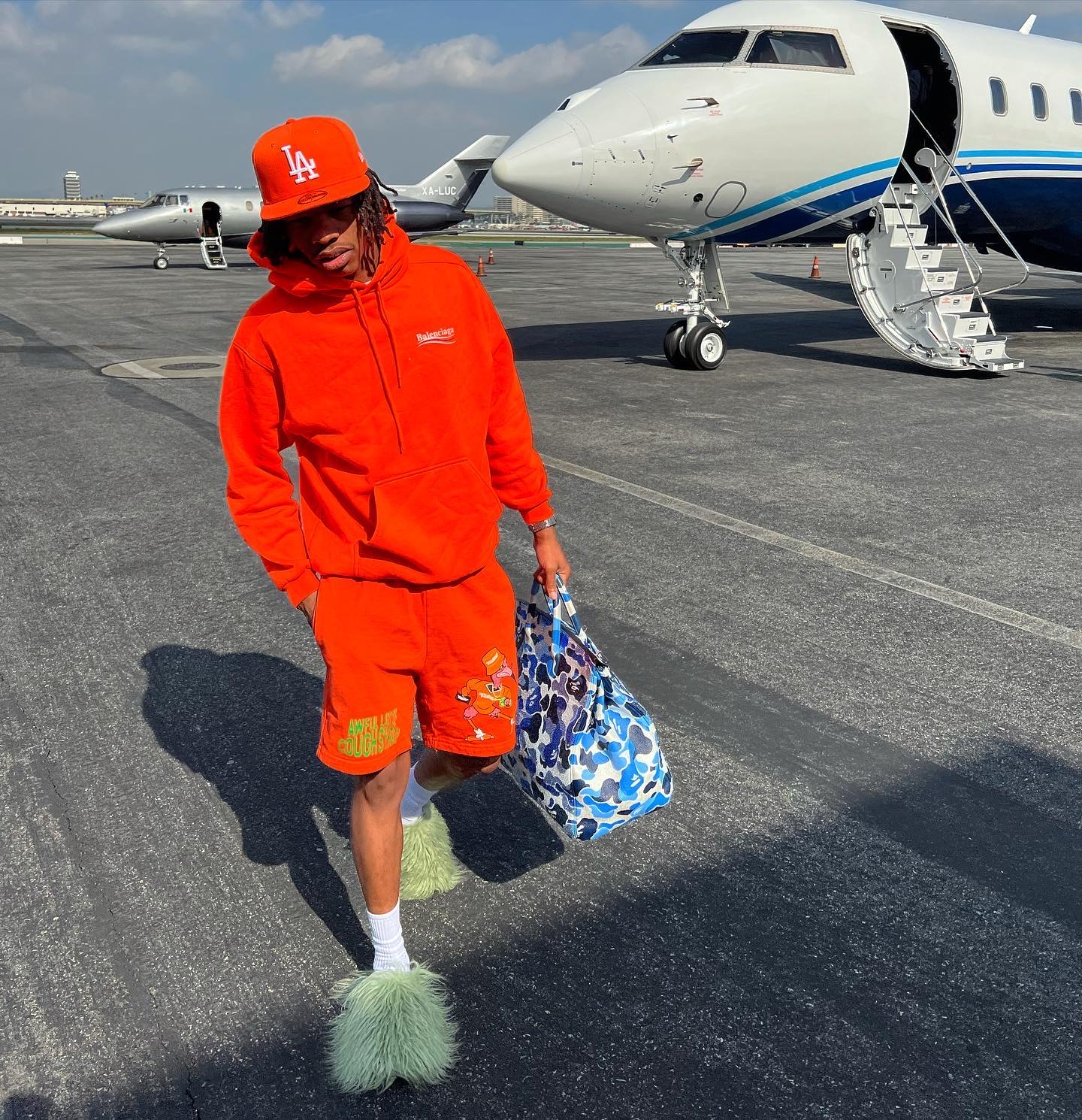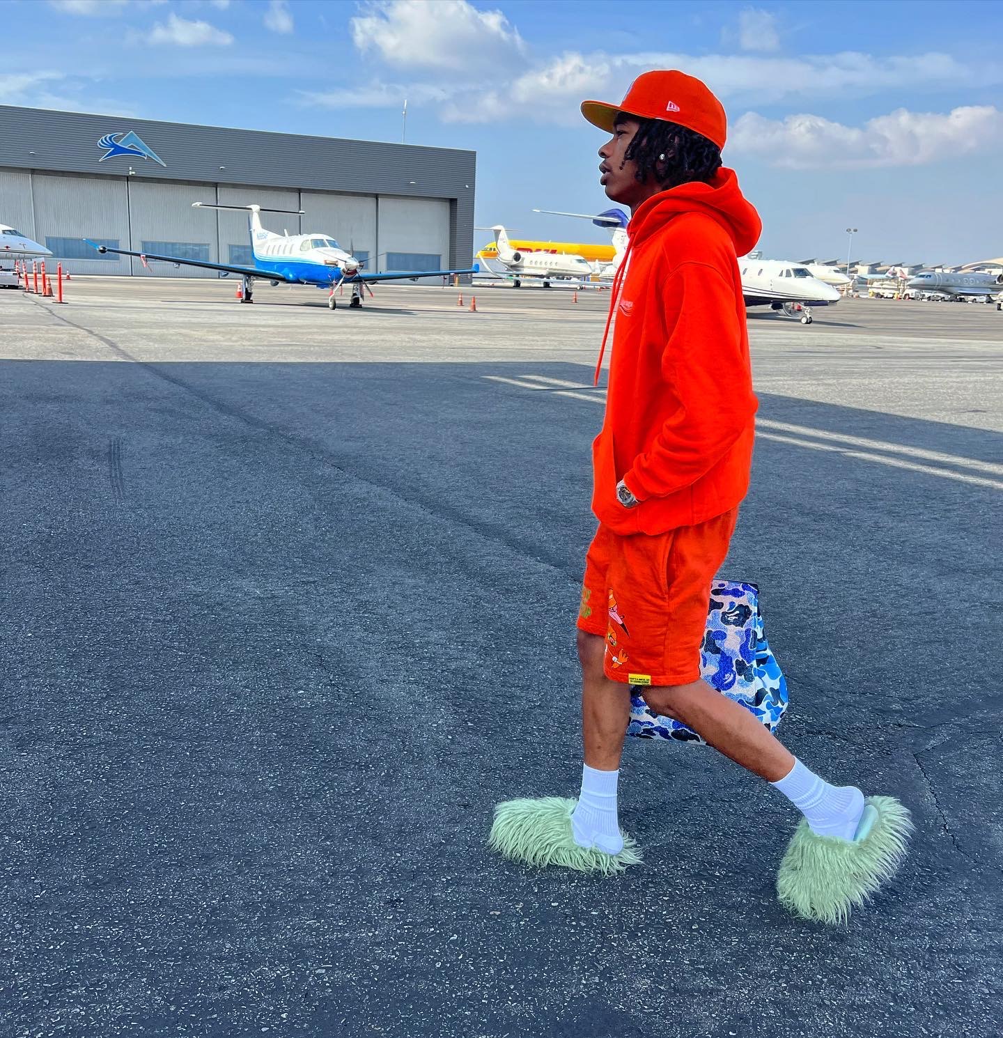 Then, Lil Baby was spied in the comfy slippers, deboarding a plane with them wearing a Balenciaga hoodie and Deebostub shorts: