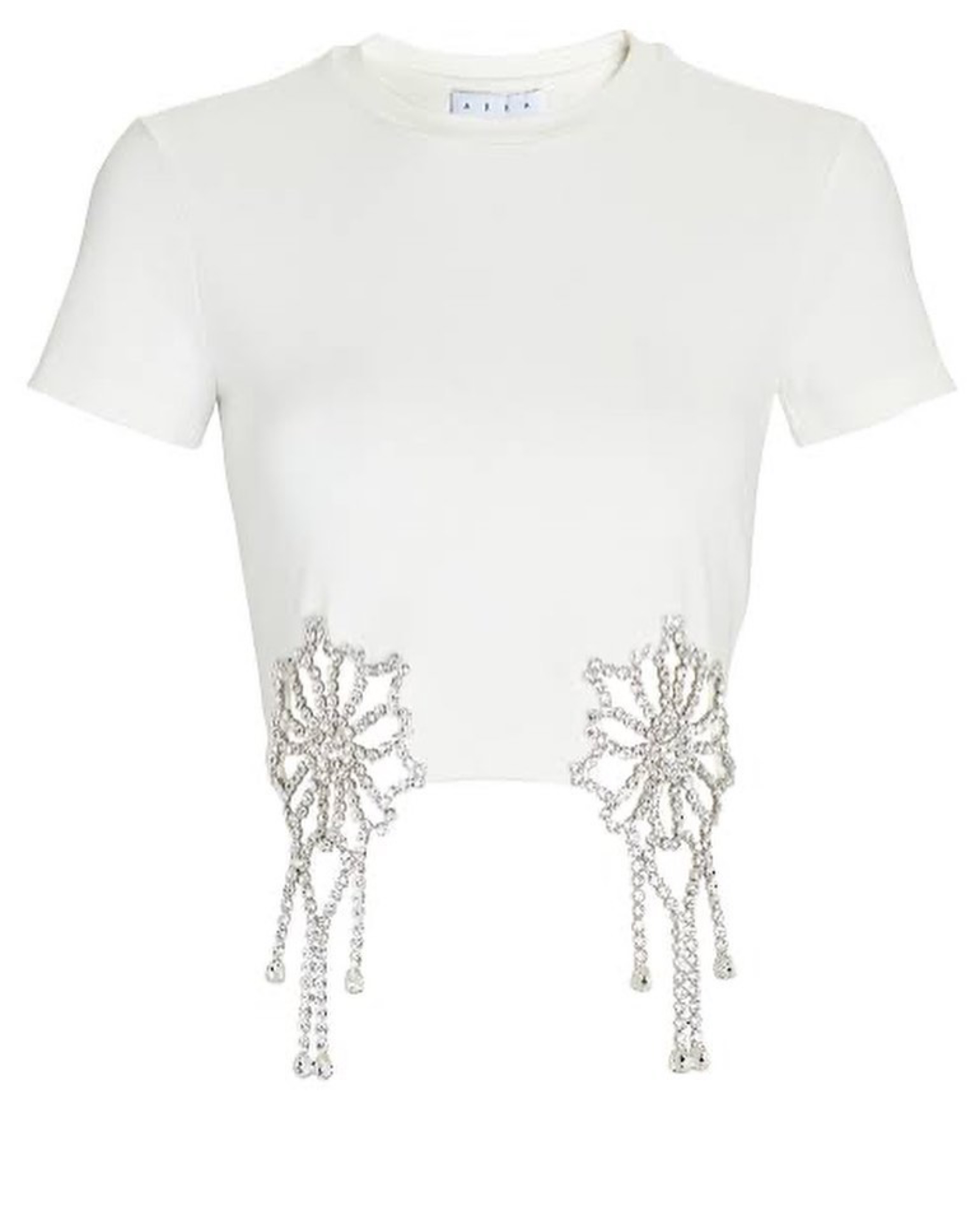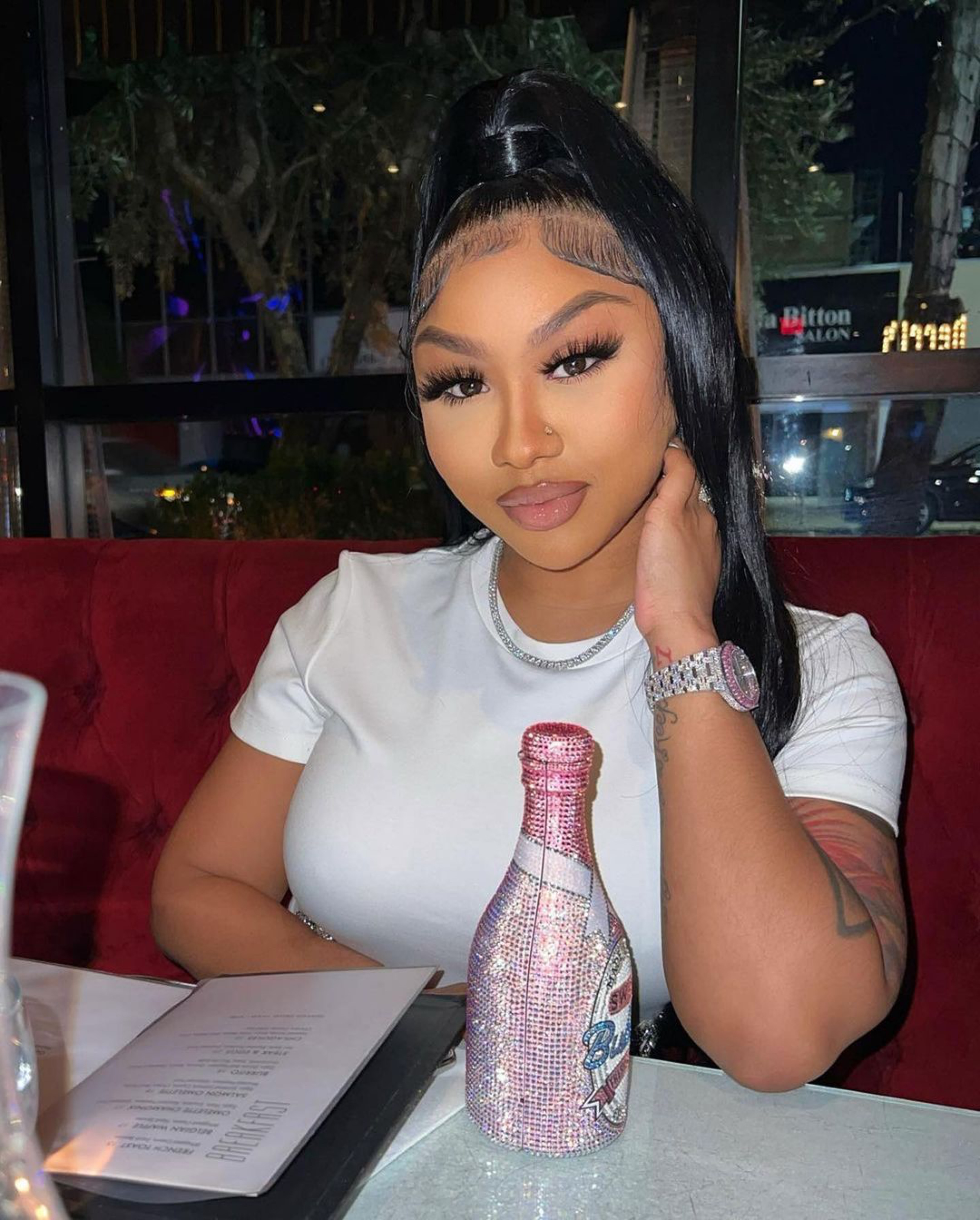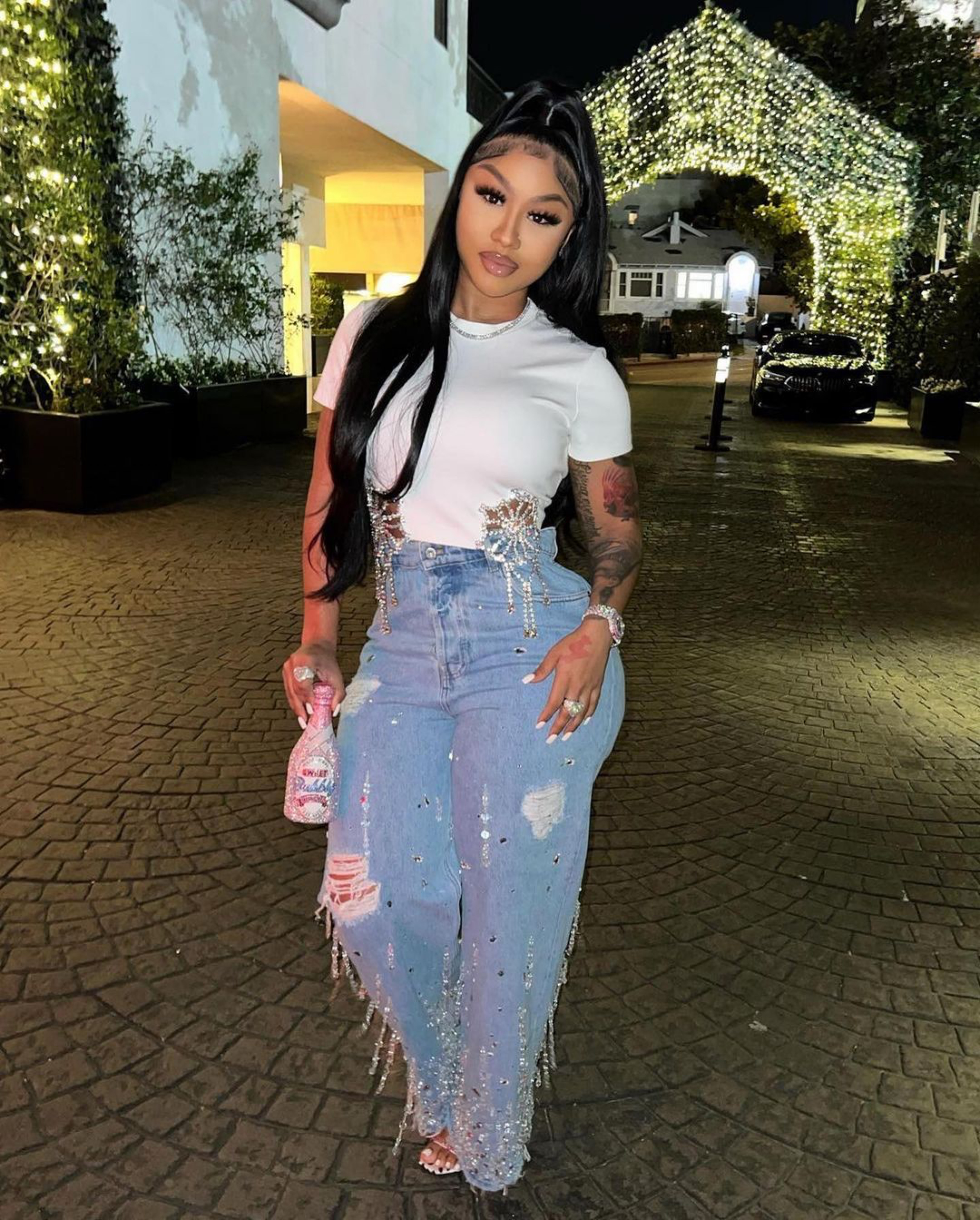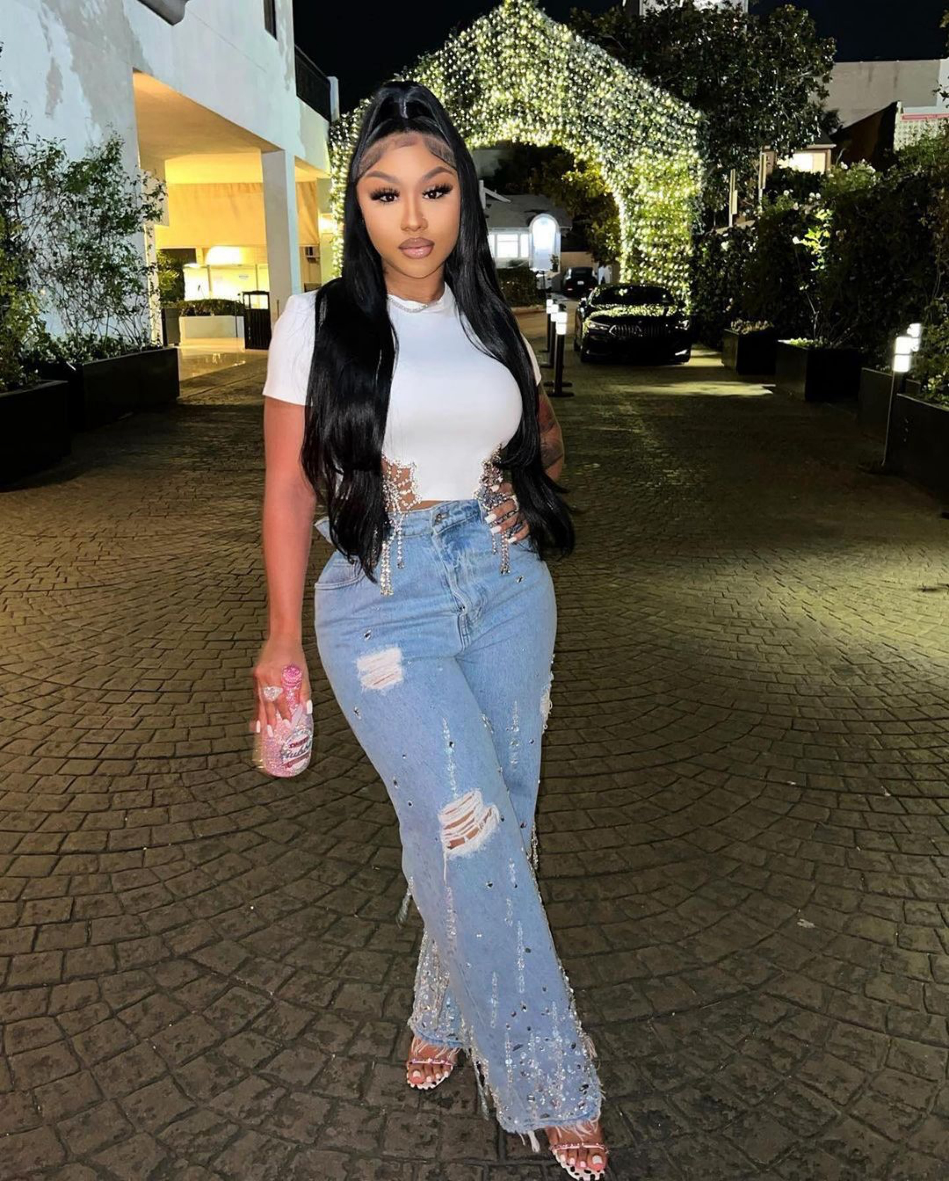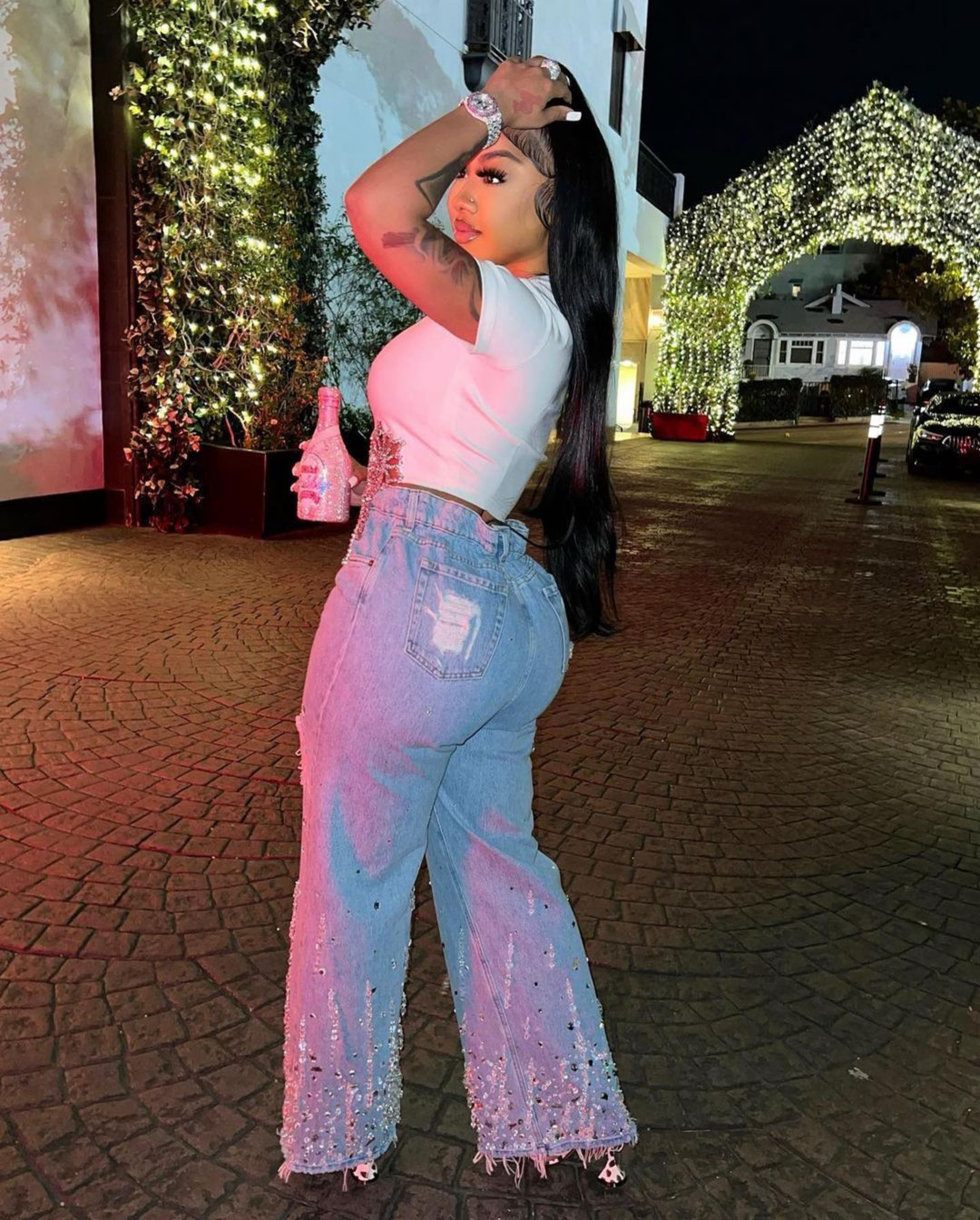 Ari Fletcher posed in a $450 Area top paired with Miu Miu jeans and a $4,695 Judith Leiber bag.