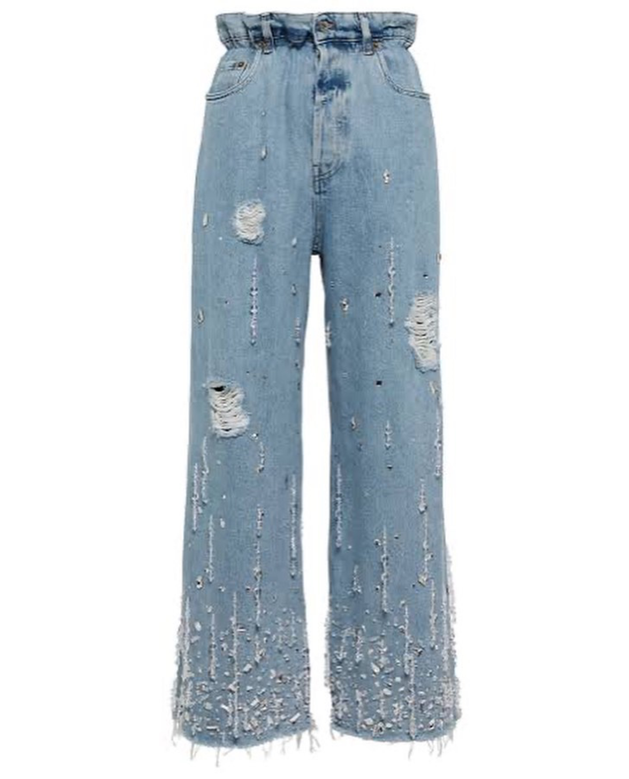 Miu Miu’s attention to detail is highlighted at the waist of these mid-blue jeans, fitted with shimmering crystals that gives them a traditional feminine note. They’re shaped in Italy to a wide-leg silhouette with five pockets and the line’s logo embroidered at the back pocket.