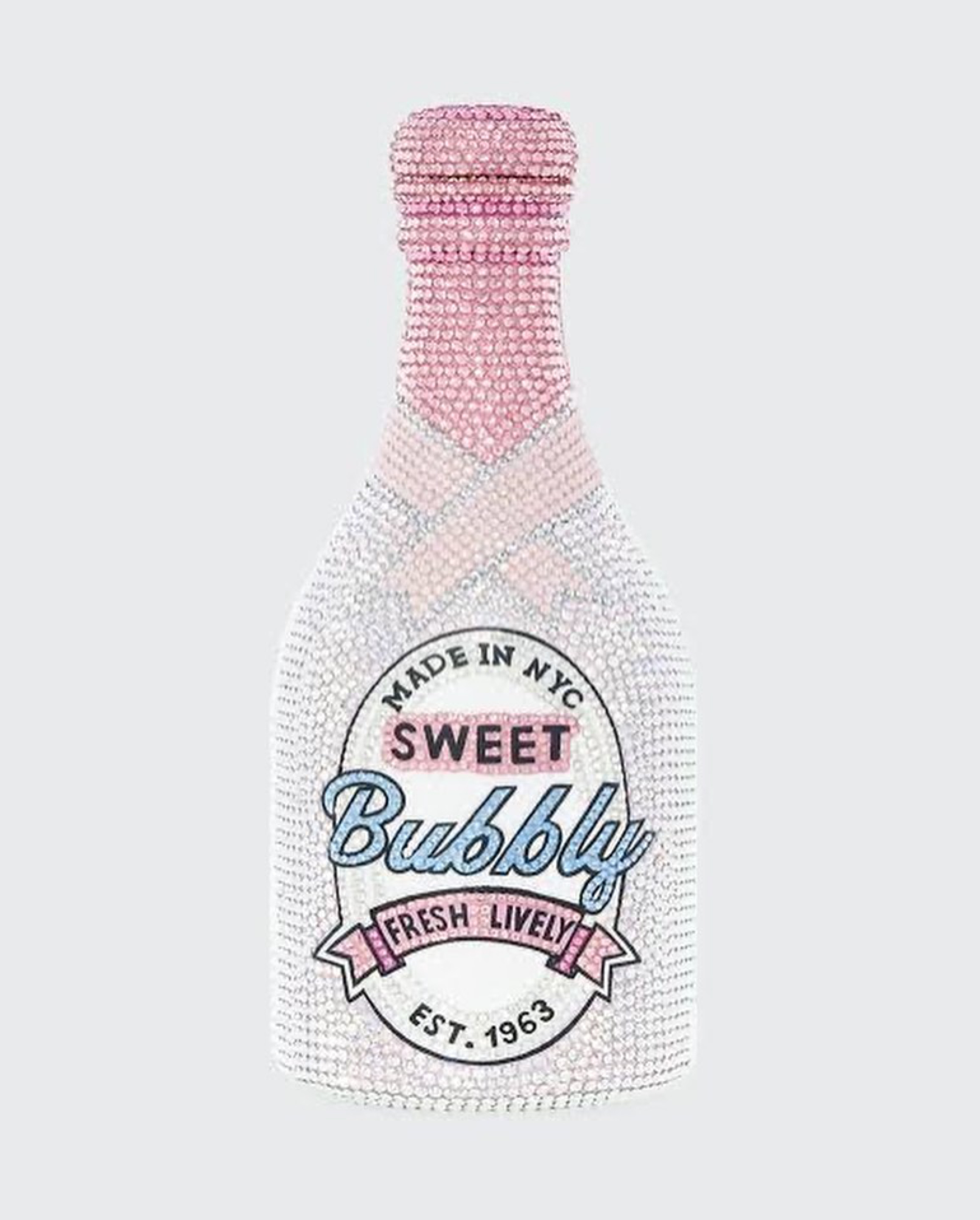 Her sweet bubbly champagne bottle bag is covered in Austrian crystals.