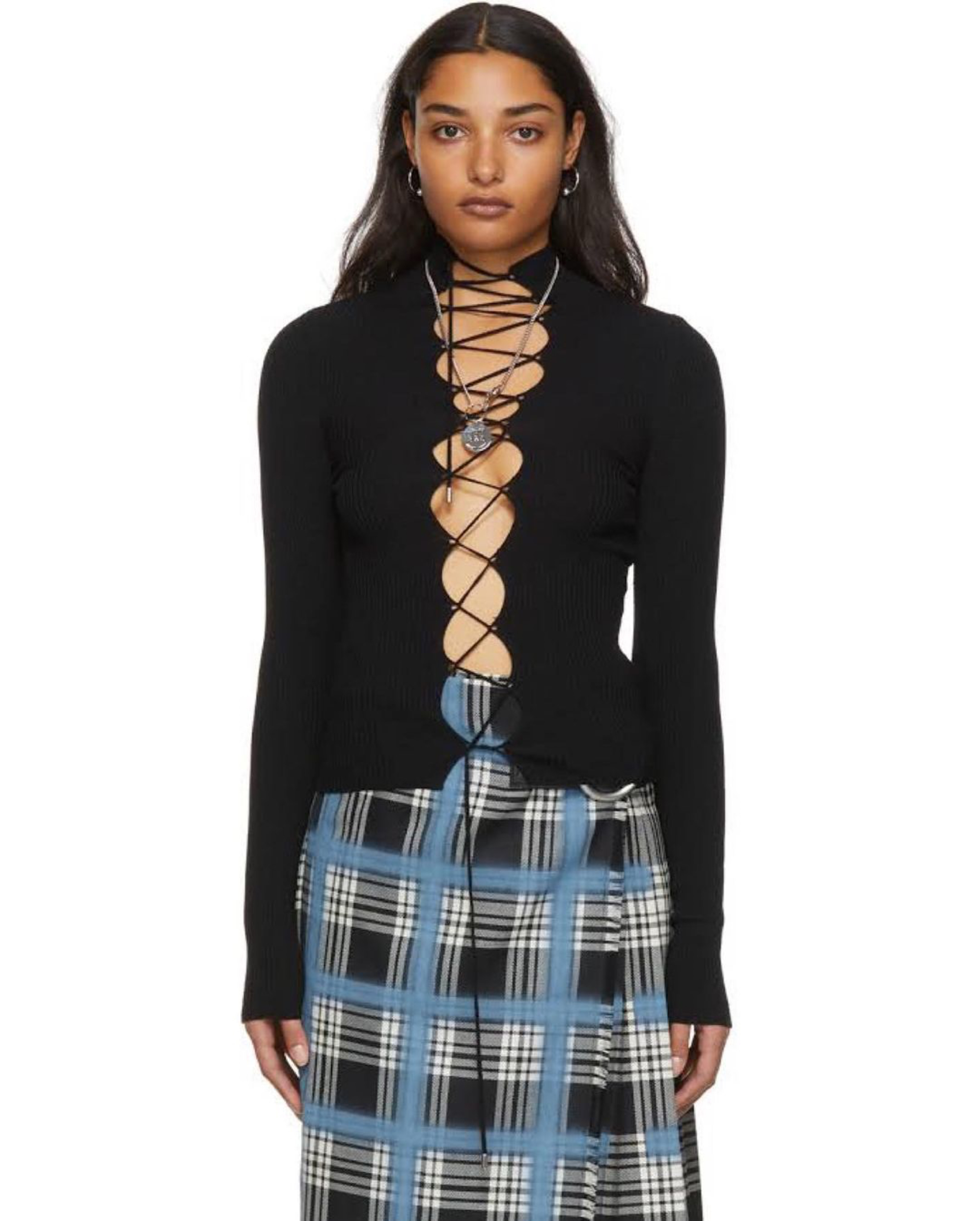 Her Rib knit stretch wool cardigan features lace-up fastening at cut-out at the front, along with silver-tone hardware.