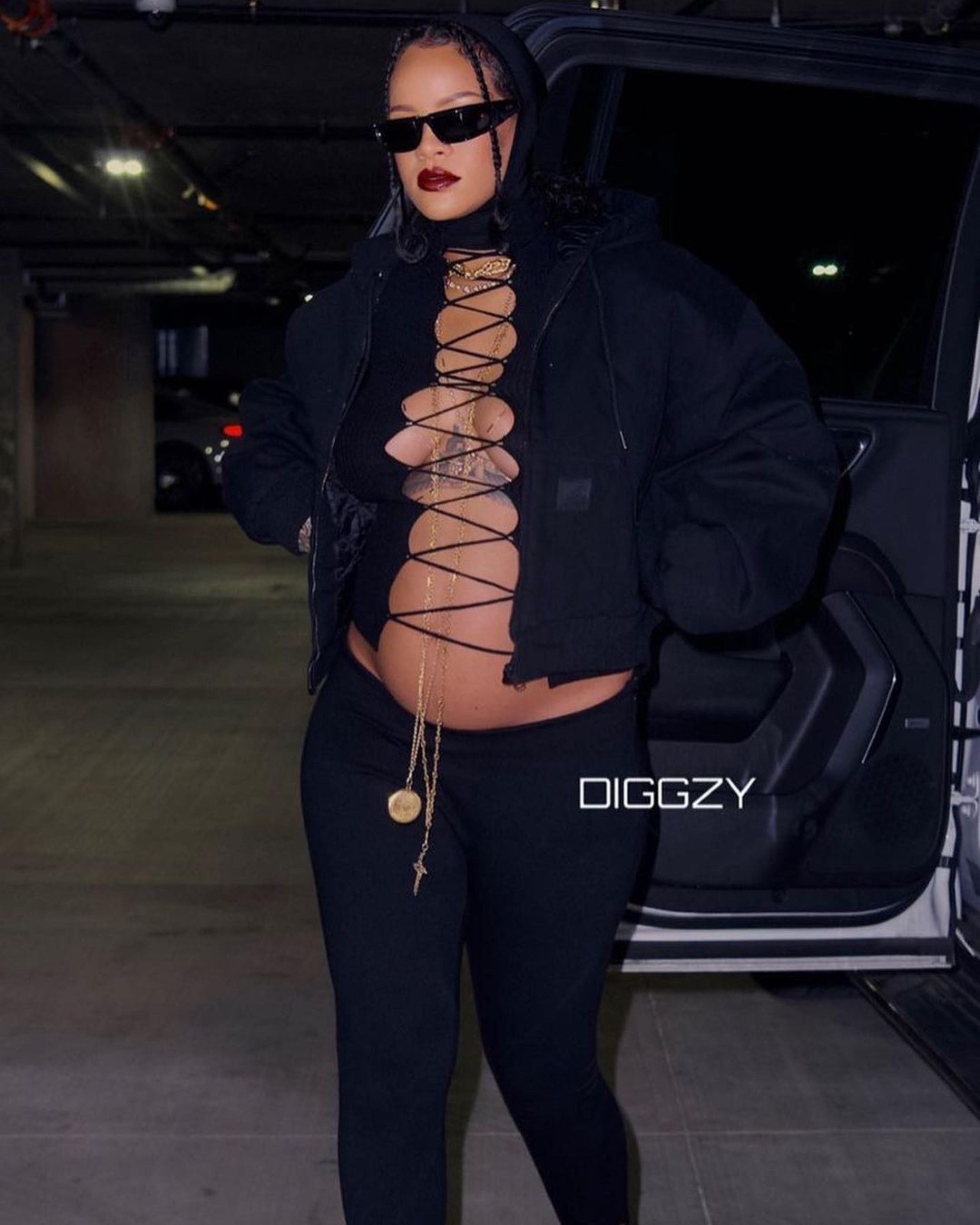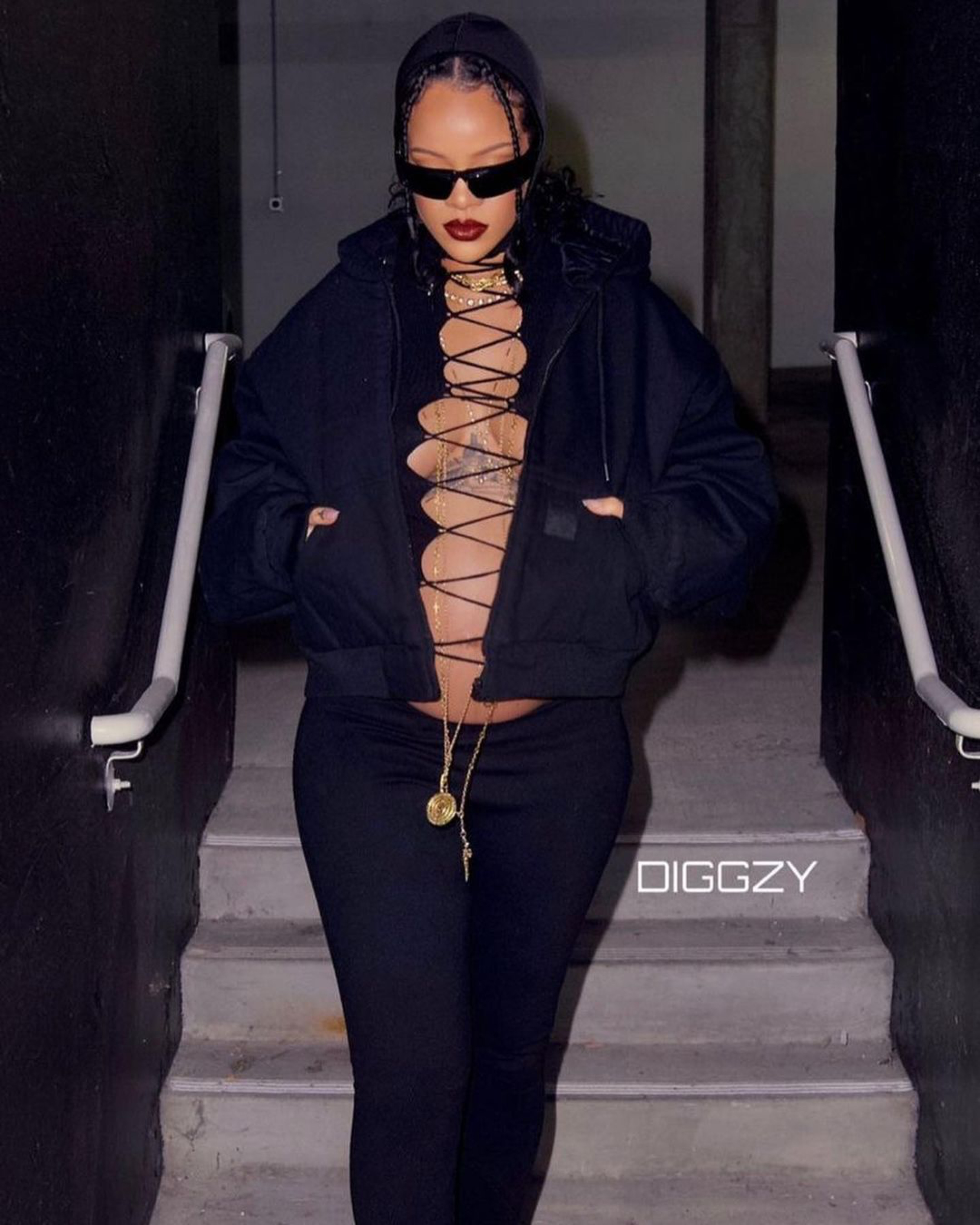 Rihanna was spotted by photographer @diggzy in LA wearing Balenciaga wraparound sunglasses, a $750 Wardrobe.nyc x Carhartt hoodie, a $525 Jean Paul Gaultier laced-up top, and $630 The Attico Jamie stirrup leggings.