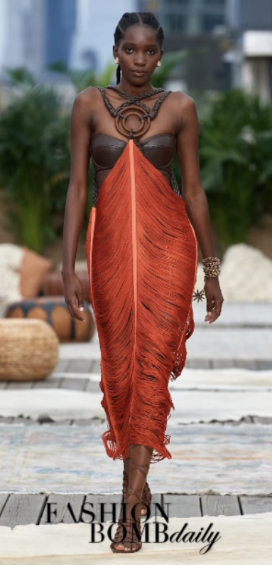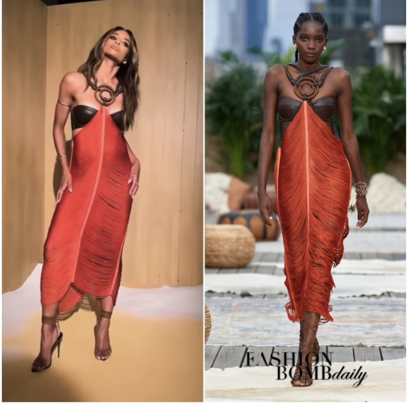 The dress is a ginger toned, sheer style including a brown, leather corset. Stylist Kollin Carter adding minimal accessories, decorated Queen Ci in brown heels and diamond studs.