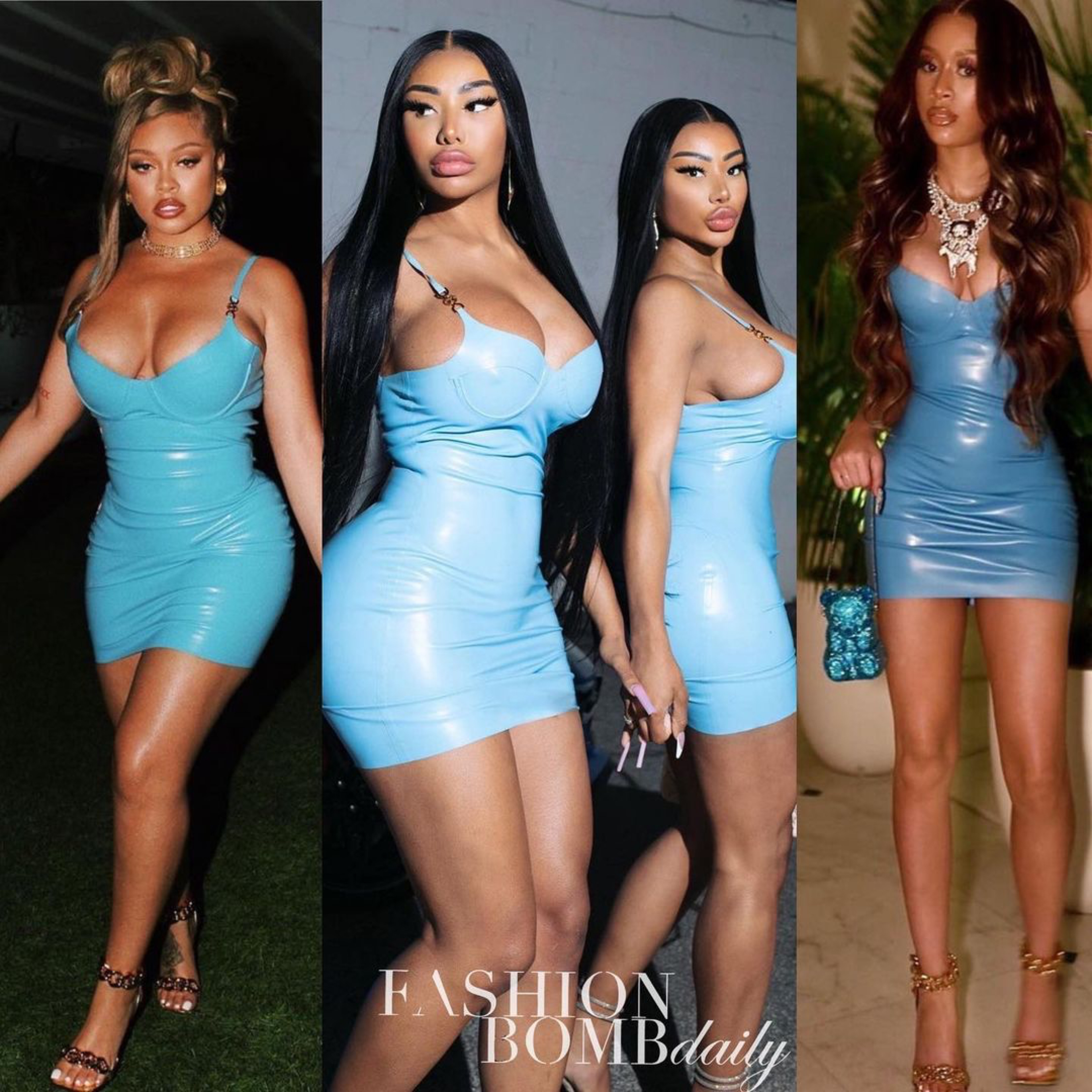 Not just one, but four ladies attended Yung Miami305 ‘s birthday party wearing this $2,325 Medusa Blue Latex Dress! Latto, Lakeyah, and the Clermont twins were all feeling this little blue number for a night out in Miami: