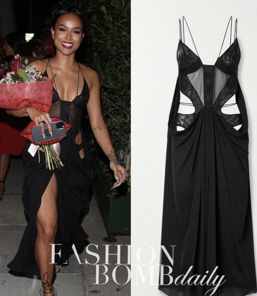 For the evening, she slipped on a black $2,810 Mugler cutout, tulle trimmed, crepe de chine midi dress.