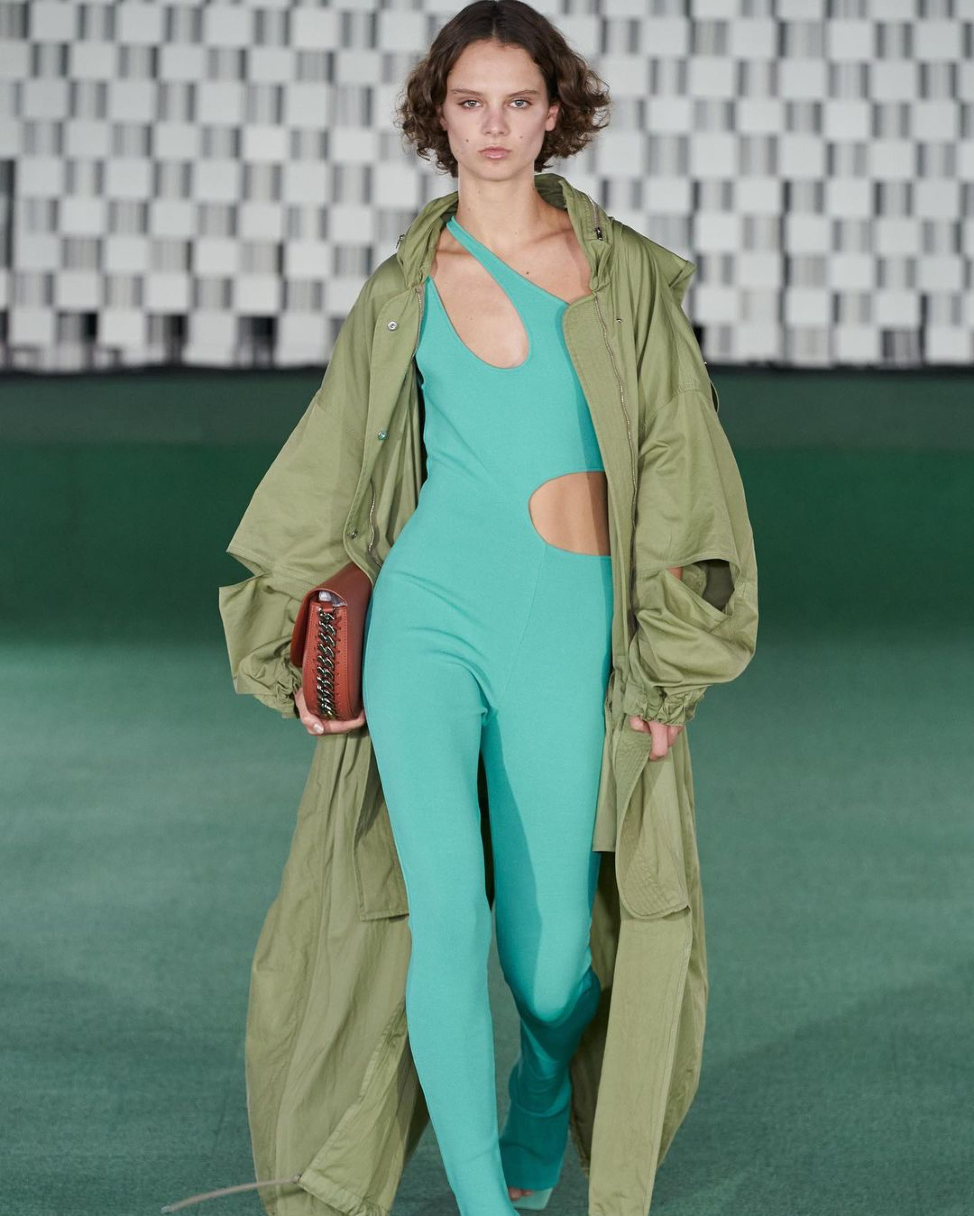 Her look consists of a pool blue catsuit, matching shoes, and an oversized parka.