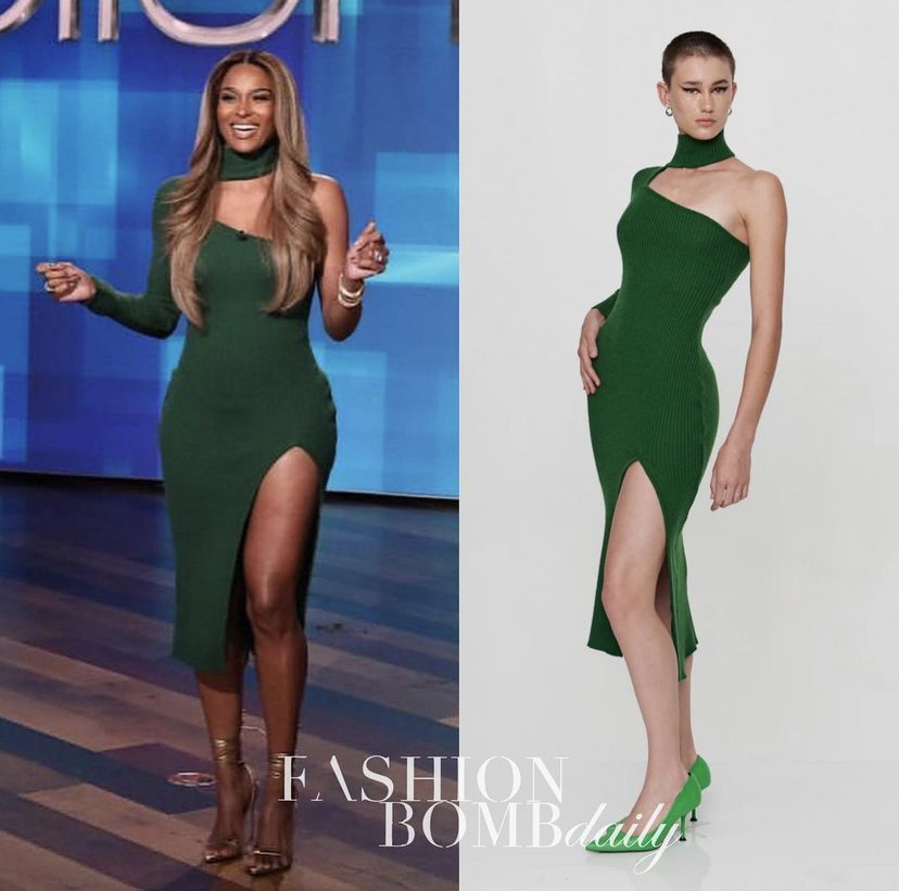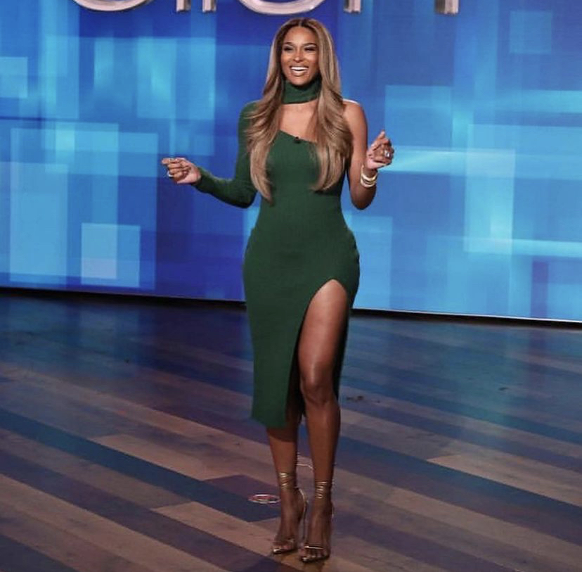 Ciara is always giving us an elegant look. She appeared on the Ellen Show in a dark green Rich Mnisi dress.