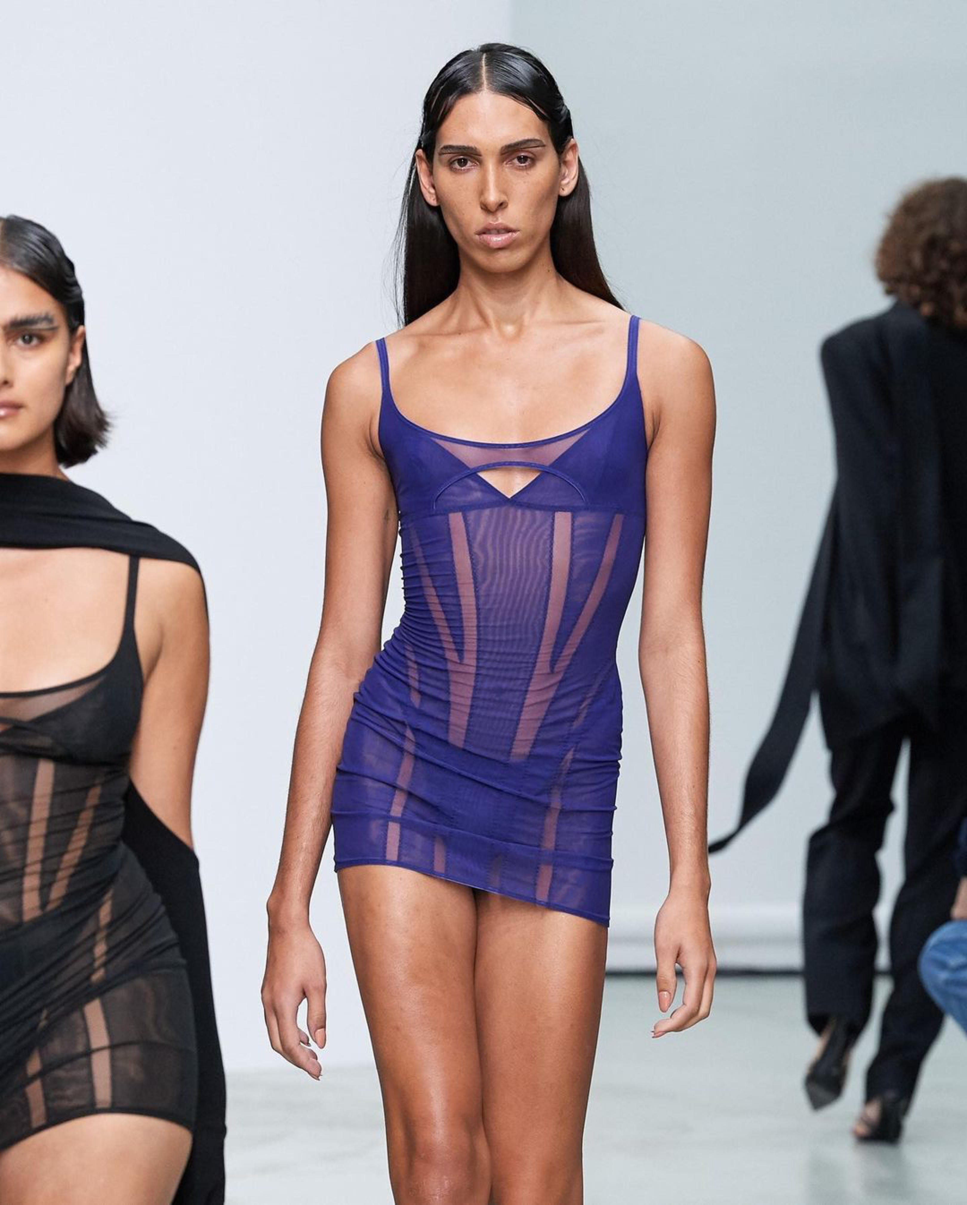 Her Mugler stretch woven dress has a slim fit, scoop neck, sleeveless, adjustable shoulder straps, cut-out at front and back, structured bodice with boning, sheer panels at front and back, contrast sheer panels at sides, tonal stitching.