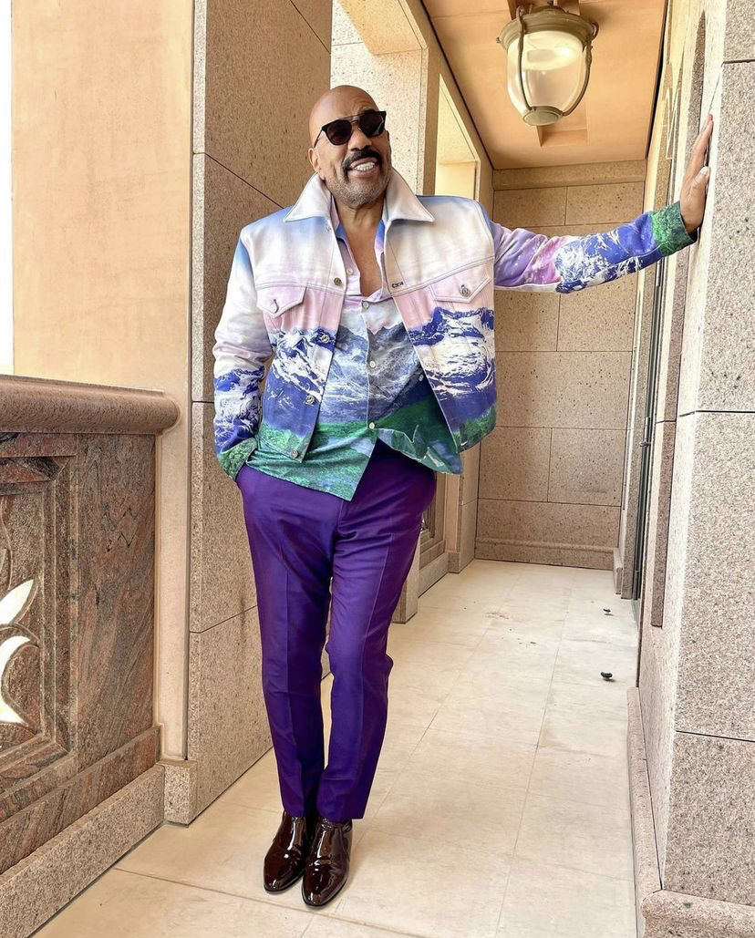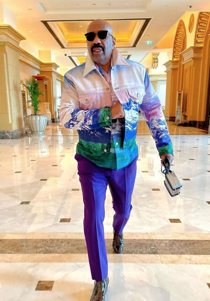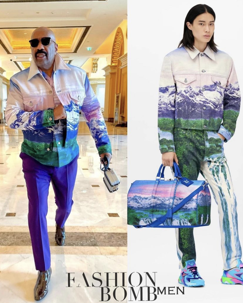 Steve Harvey stepped out wearing a full Louis Vuitton x Virgil Abloh look, including a $4,000 landscape jacket.