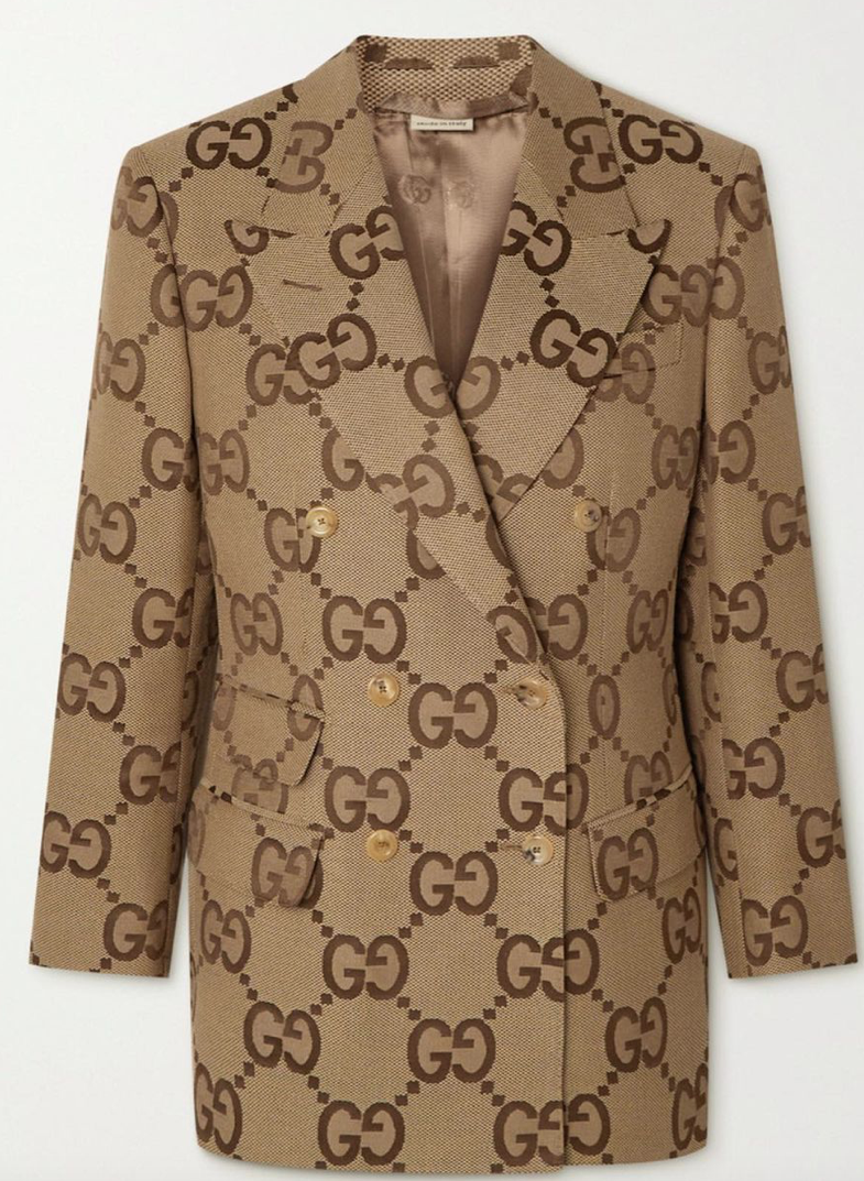 Gucci’s blazer is jacquard-woven with the house’s iconic ‘GG’ logo, making it an instantly recognizable piece. Tailored in Italy from cotton-blend canvas, it has a double-breasted profile with sharp peak lapels and an unrestrictive back vent.