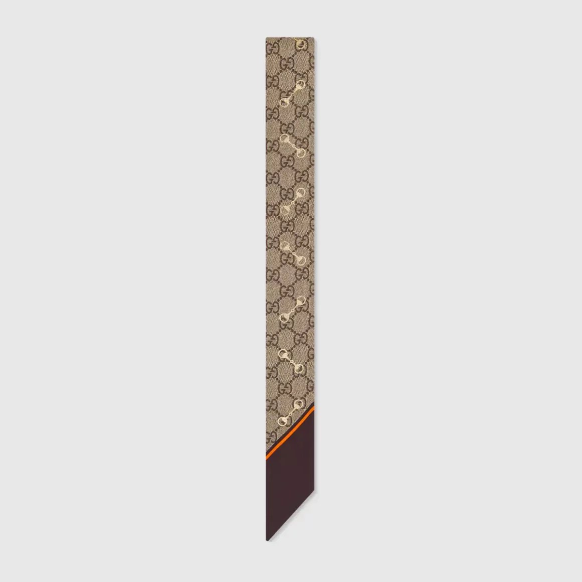 Inspired by an archival detail, the classic GG design is paired with a gold Horsebit print, defining this neck bow. The neck bow continues to be an important design element that was introduced in Alessandro Michele’s first Gucci collection.